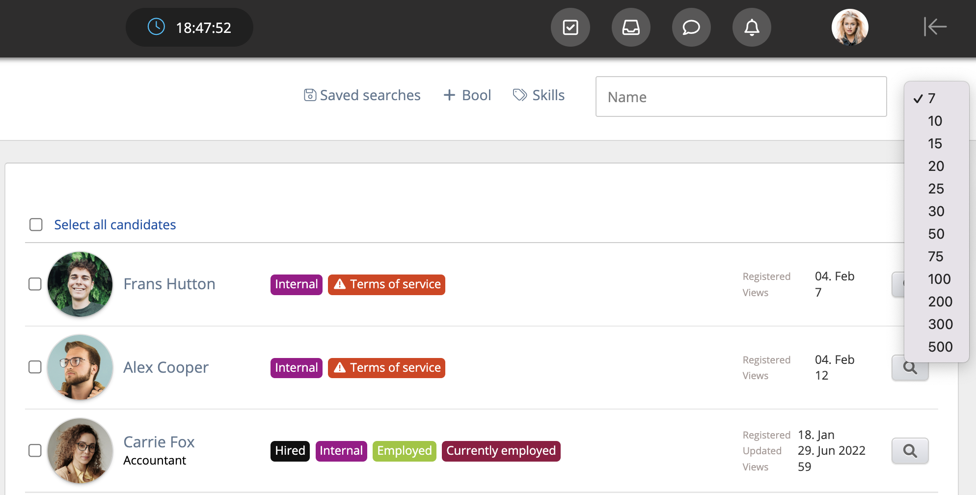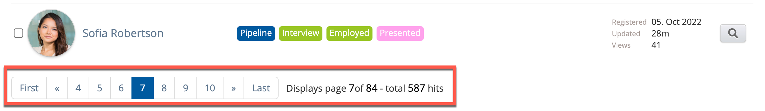 You’ll also see the number of pages in total and how many hits are based on your search criteria. In the case below, we see that the system has found 587 hits in the candidate base and that we’re currently on page 7 of a total of 84 pages.