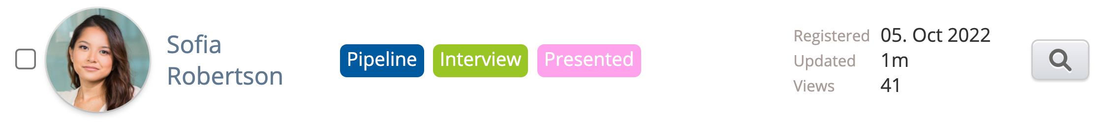It is often desirable to display important information from a listing without necessarily having to click on a particular candidate/customer card. For example, in the candidate database, we want to see the list of candidates who have been in an interview, in a candidate process or have applied for one or more positions. You can see this information in the tags, and you may click the tag, for example, an interview tag, to get to the interview box on the candidate card.