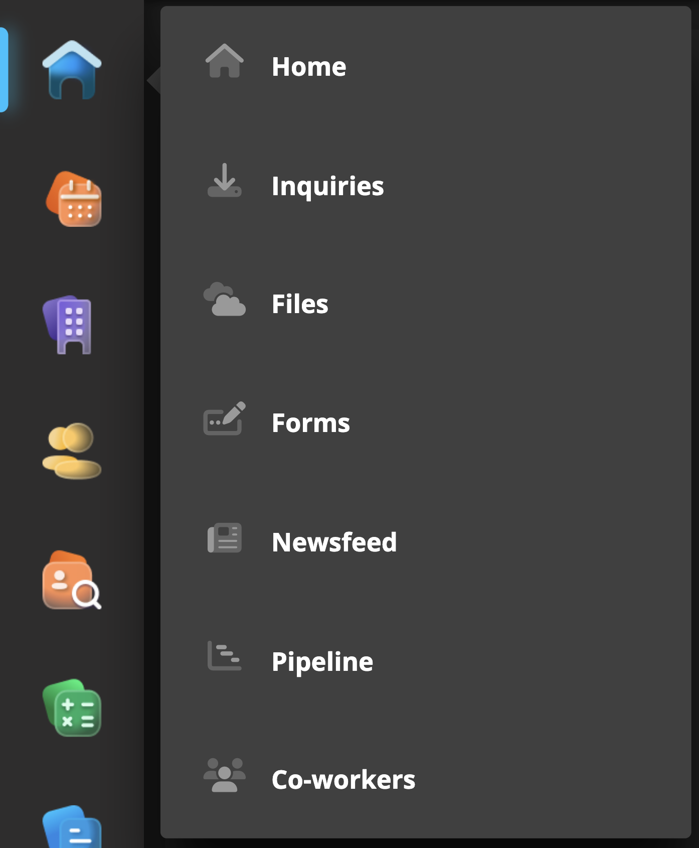 To make it easy to keep track of where you are in the system, you have a menu bar on the far left side of your screen – the Navigation line. It allows you to switch between the different main modules of the system. The module you’re currently standing in has a colored backlight (in the picture to the left, we’re in the Home screen).