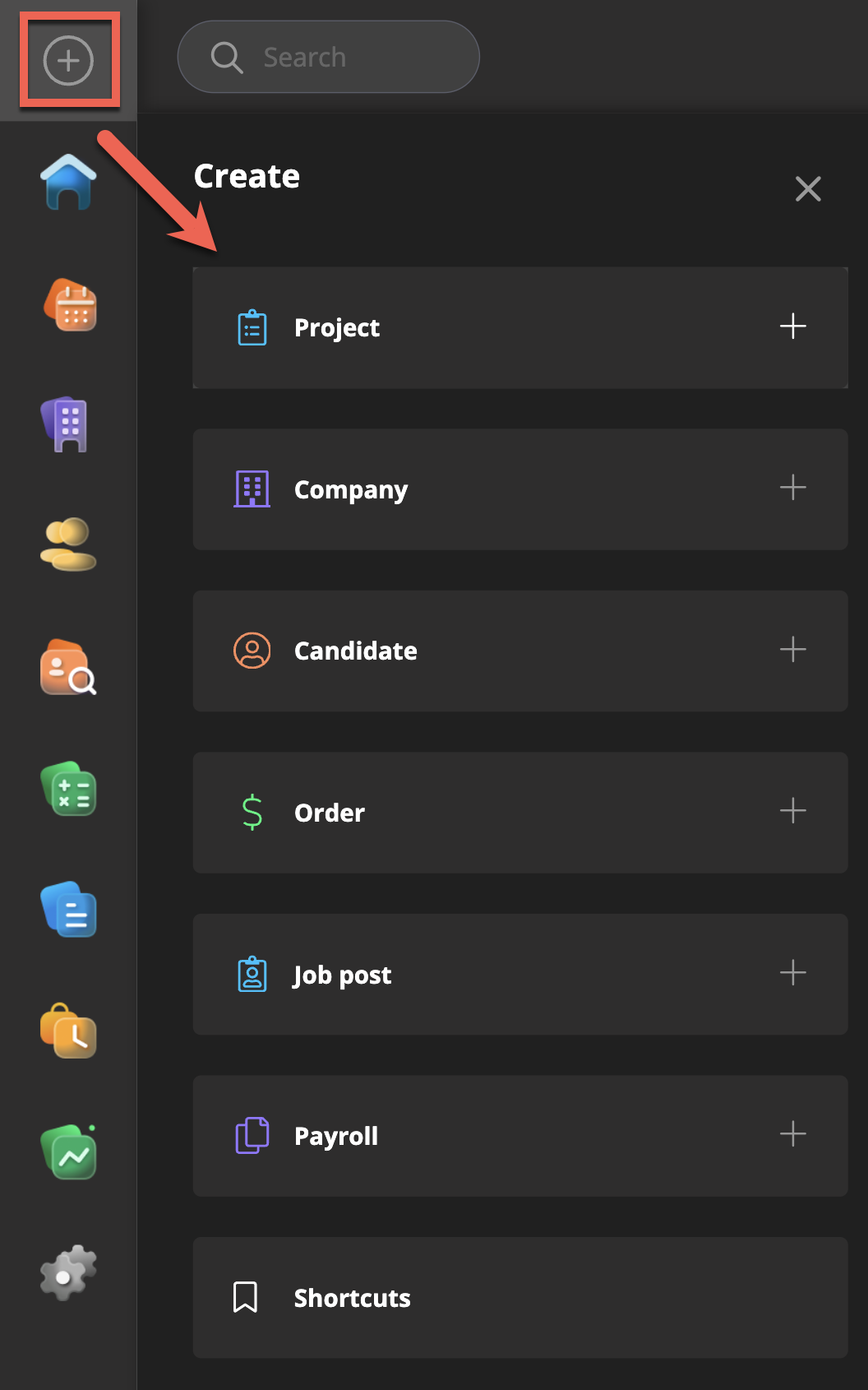 In the top left corner, you can see a plus icon, which gives the possibility to easily create various entities like projects, companies etc.