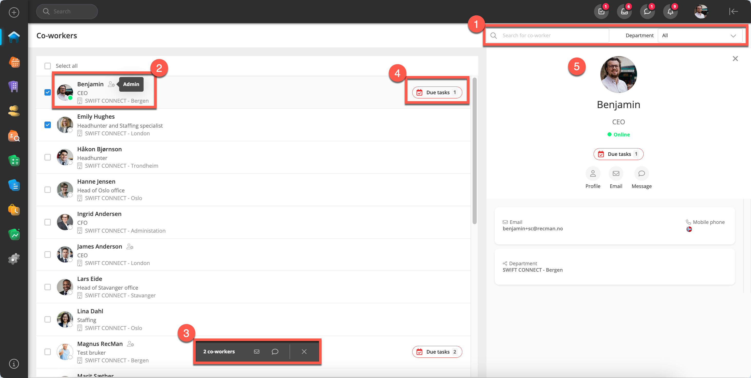 By clicking on a co-worker, a drawer opens (on the right-hand side) with more information and features for viewing the profile, sending emails and internal messages. You may also select multiple co-workers, which enables features for sending emails or messages to the selected co-workers. A green dot next to their profile picture indicates their online status, and to the right side all due tasks will be shown for each co-worker.