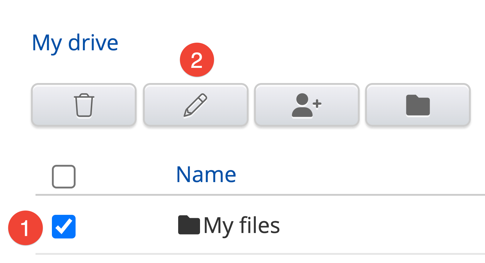 To delete, move, edit the sharing options or change a filename, first click the checkbox next to a file (1). You will then get a row of buttons on the top of the screen (2).