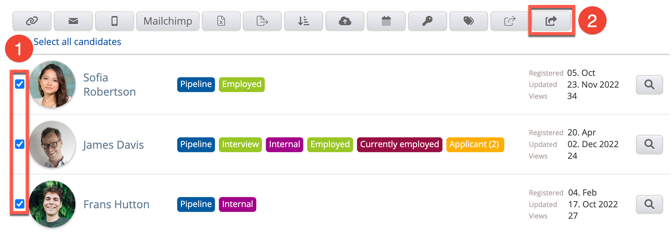 Select one or more candidates from the list. Here you can apply filters in order to find the candidates you wish to share the file with. Once selected, a row of buttons appears on the top of the image. Here you click the button to the far right.