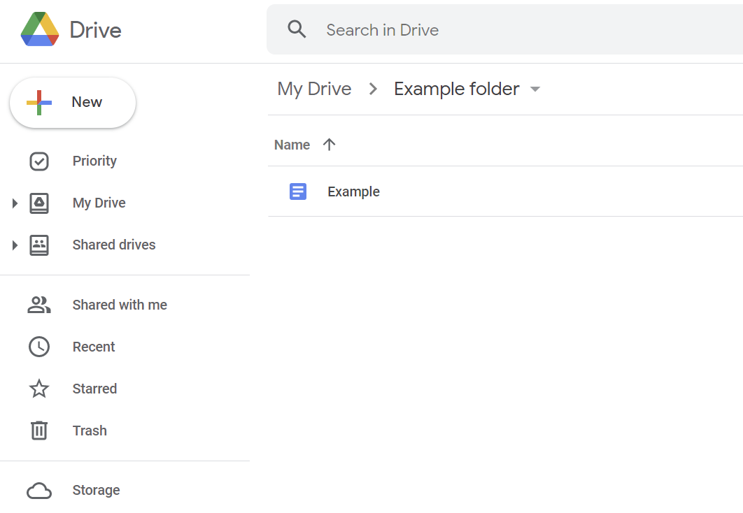When you are inside the overview in Google Drive, you see all the files, folders and documents you have stored there (in the case below, there is a folder named Example folder and a document named Example).
