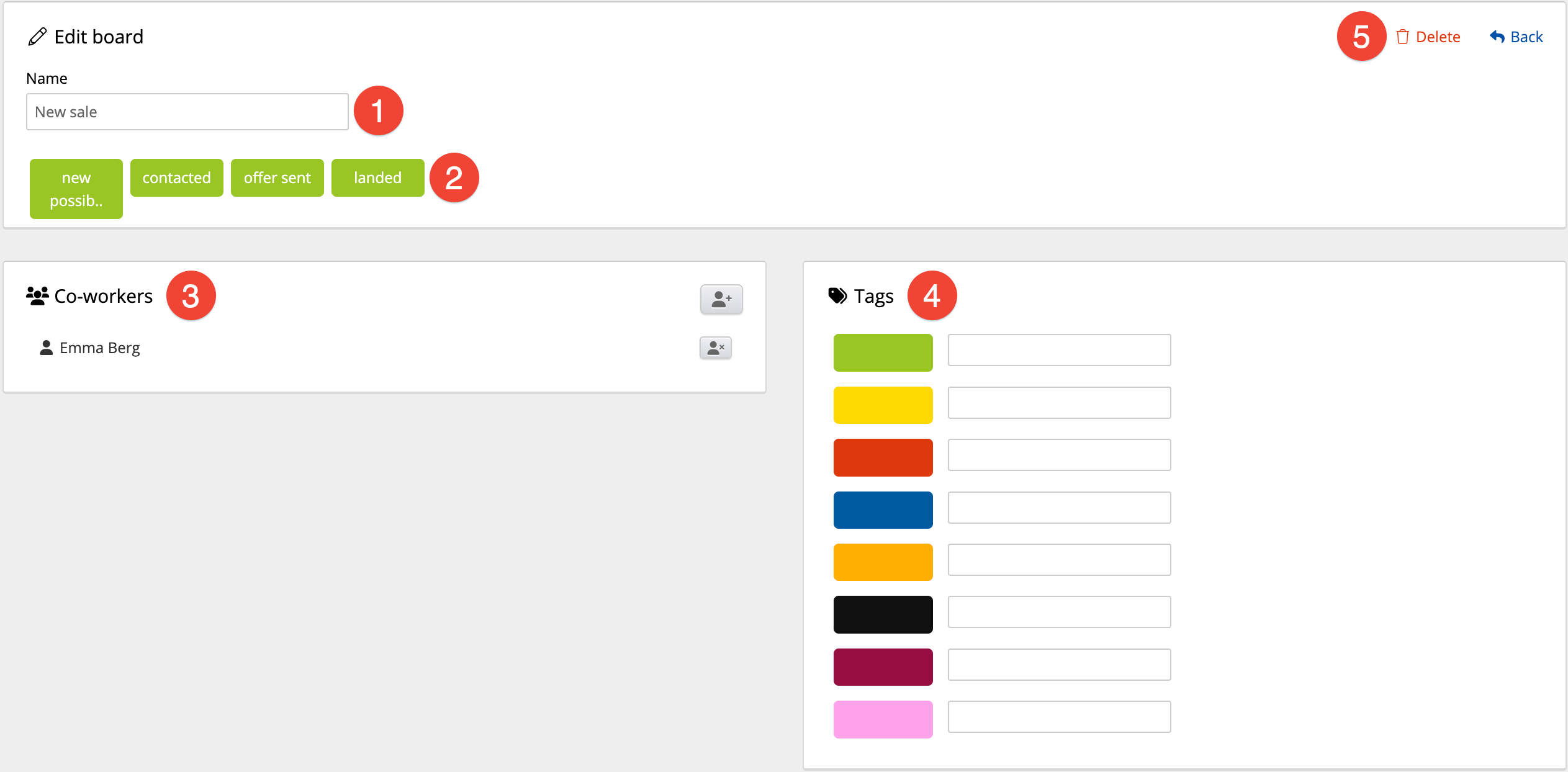Here, we have the option of adding tags. These tags are always available on your board, but here you have the option of adding a small text. These can be used to mark different customers and simply illustrate different important notes.