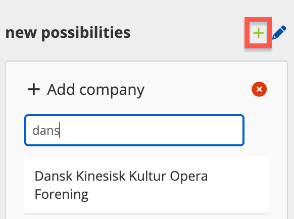 As is apparent, when you press the +, a box will appear where you can search among your companies. As soon as you start writing, the system will start searching in your CRM and find companies. Press the company you wish to add. When you have chosen the company, a card will be created on the list that you chose.