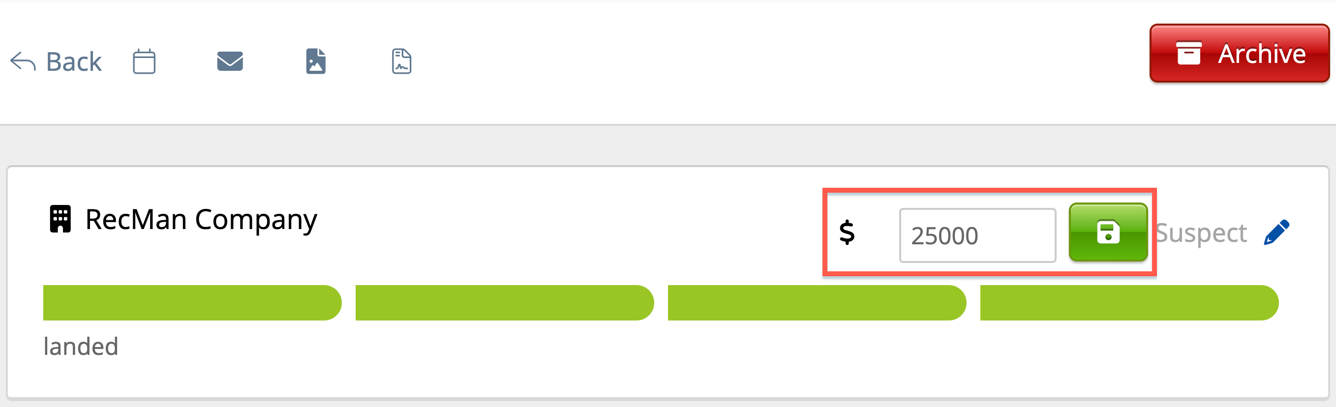 You are also able to set a value for each card in the pipeline. Just click the dollar icon and enter the value. What the value means is something we recommend you and your co-workers agree on internally.