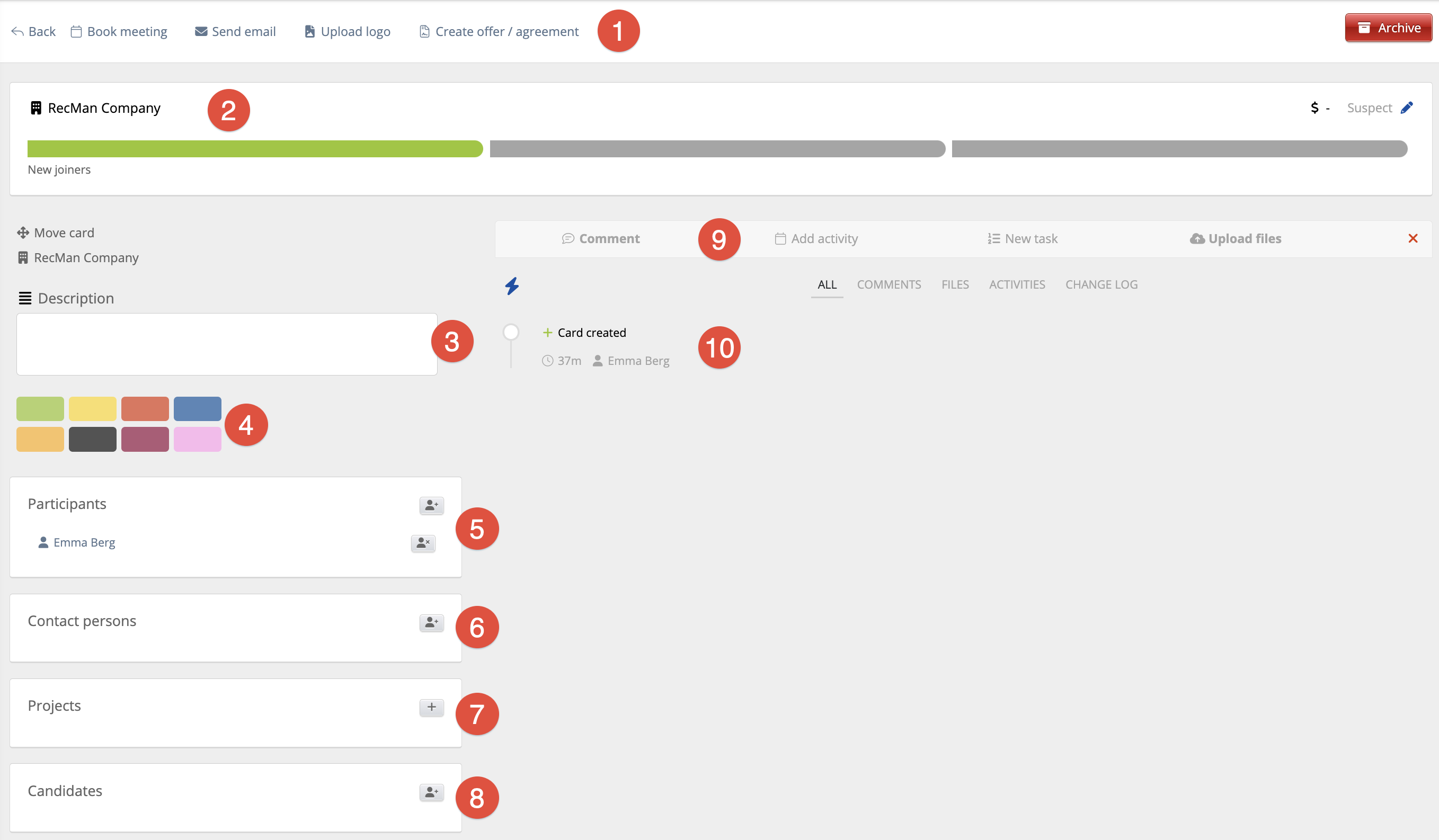 - From this part of the card, we can easily do several things. All the functions can be linked to contact persons in the company. These functions work in collaboration with the activity log (point 10) to give an exact timeline on the card. We will shortly go through them here:
