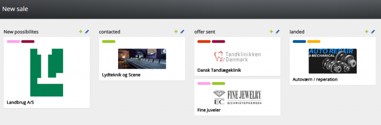 My co-worker and I have a board called New Sale. In this board, we have 4 lists called new possibility, contacted, offer sent, and landed. When you acquire a new customer, it opens up new possibilities. Depending on what happens with the customers, moving them to other lists may be relevant to retain an easy overview of which customers you have in your pipeline. A card can contain many customers, and the company pipeline gives you an excellent overview. More examples and illustrations will follow.