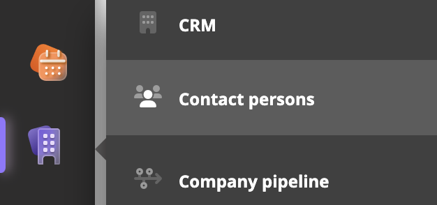 You find your company contact persons in the systems CRM – Both on the card of the customer they belong to, as well as the company contact person overview. This overview can be found in the navigation line while you hover over CRM.