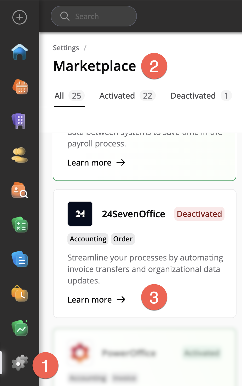 To activate 24SevenOffice integration, go to the System settings and select Marketplace.