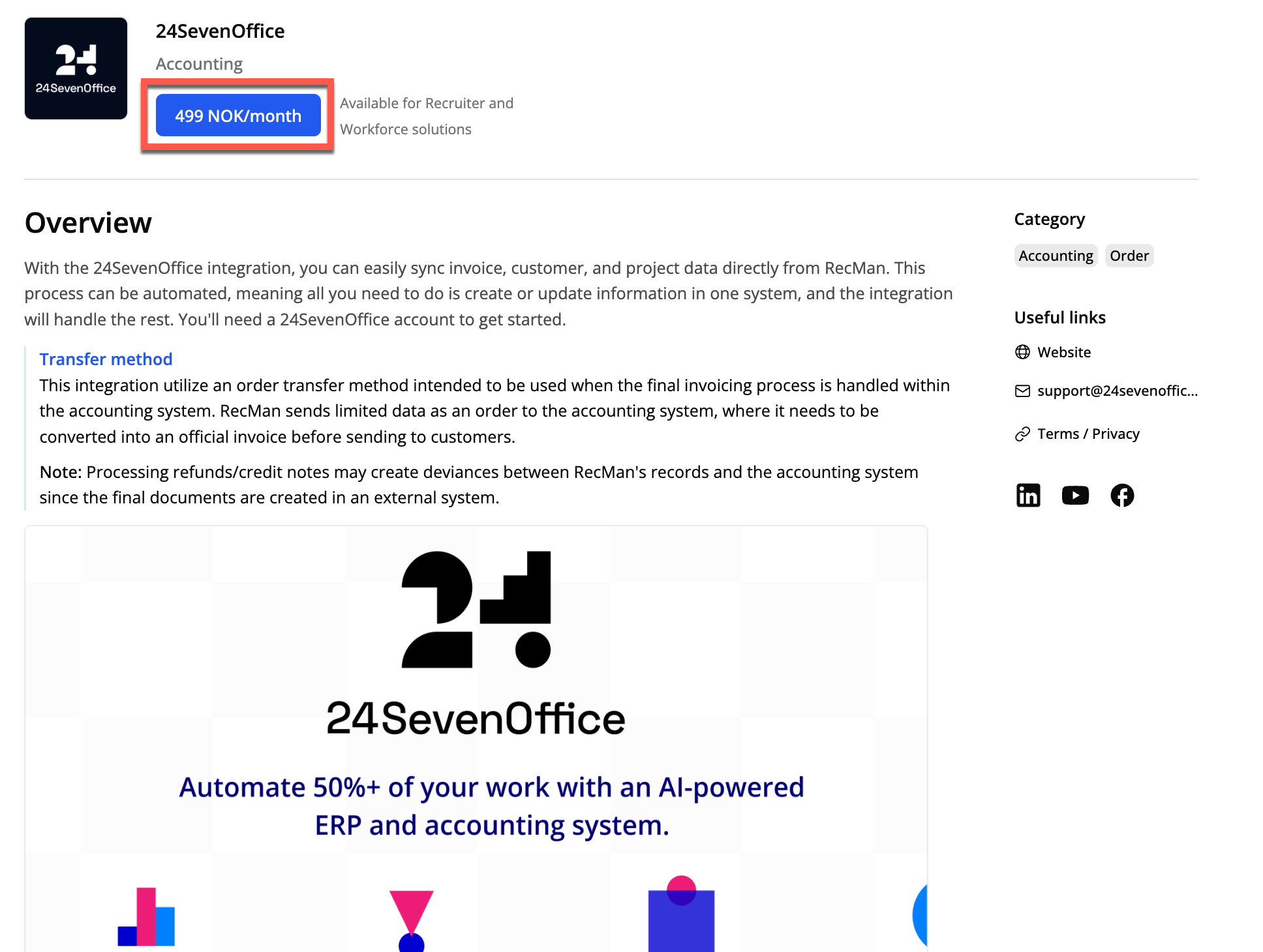Click the blue activation button with the price to begin using the 24SevenOffice integration.