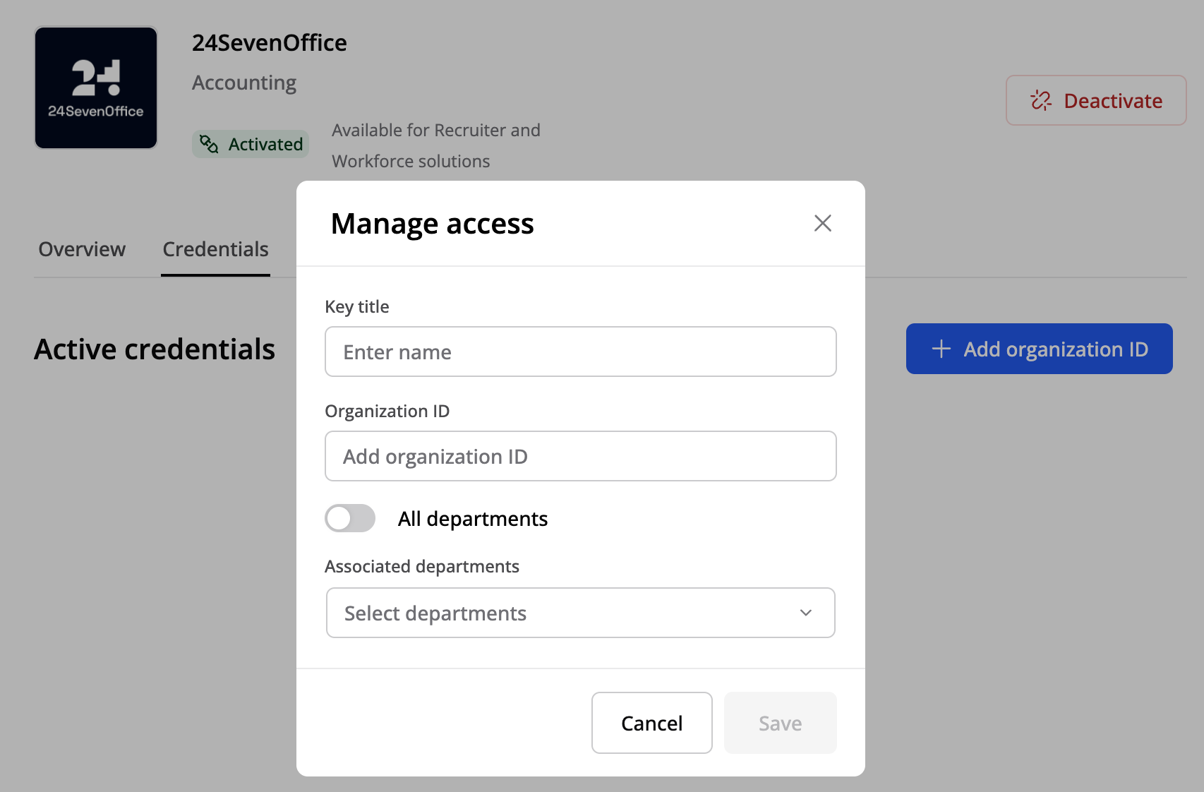 The next step is to add your Organization ID from 24SevenOffice. To get it, follow the instructions that appear on your screen and then choose which departments should have access with this key to 24SevenOffice: