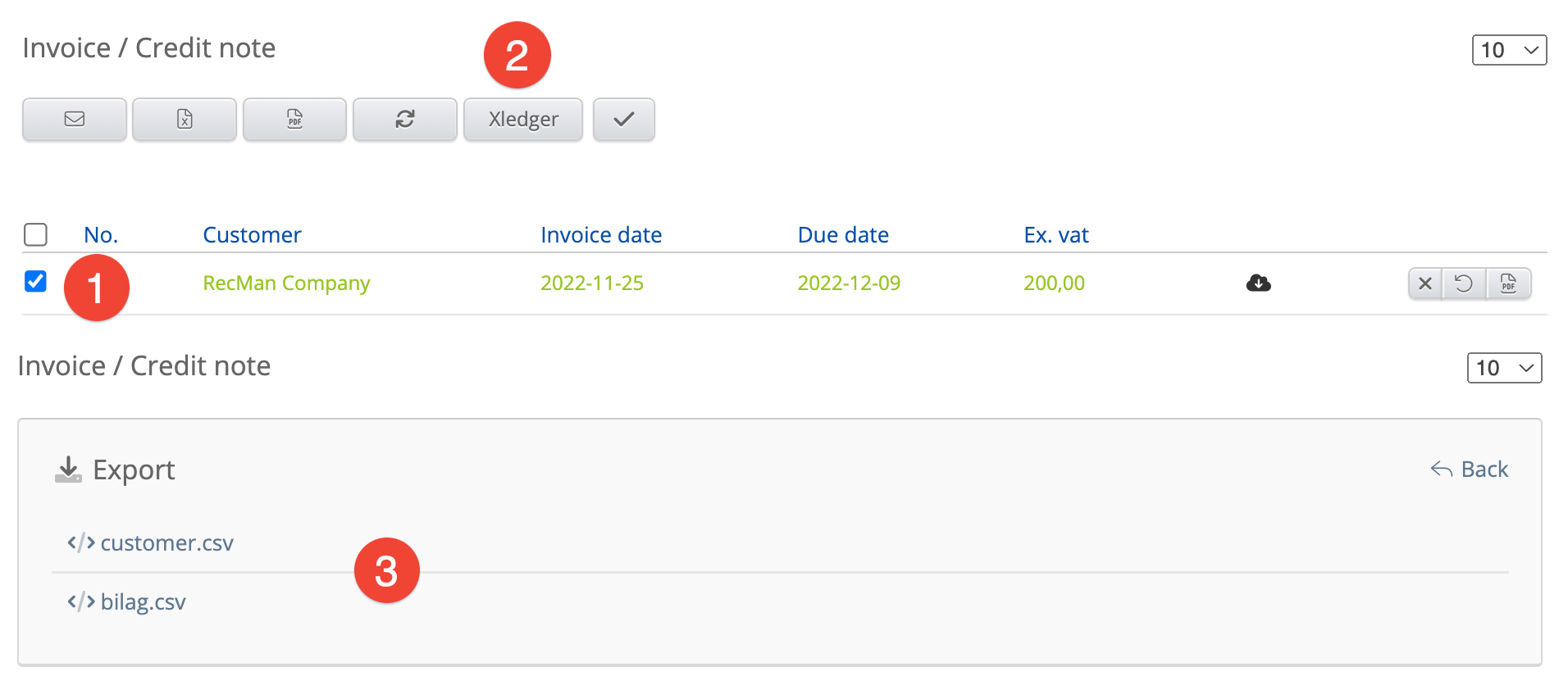 When exporting to Xledger, it can be good to have an understanding of which fields from RecMan are included in the file export. We will explain this in more detail in this part of the article. The first thing to do is generate the Xledger files, which is done by selecting the relevant invoices and clicking on the Xledger. Then, you will get two files you can download (shown in the image below) in the CSV format.
