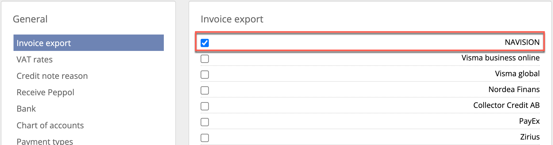 Go to System Settings → Economy → Invoice Export and check Navision as an option for invoice export. Then, Navision will appear as a choice in the invoice overview when you have ticked the relevant invoices.