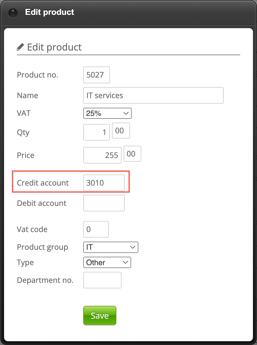 The image below shows where you enter the credit account (press the Edit button in the product overview). As stated, these must correspond with similar information that is registered in Navision.