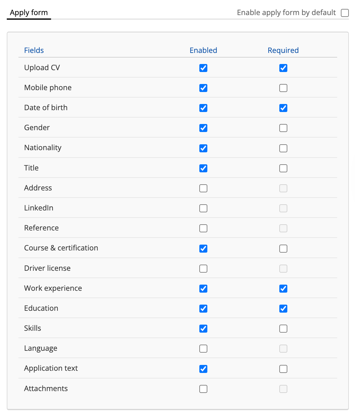 Here, you can configure default apply form settings. Define which fields are enabled and which are mandatory. These defaults will automatically apply to new job posts.