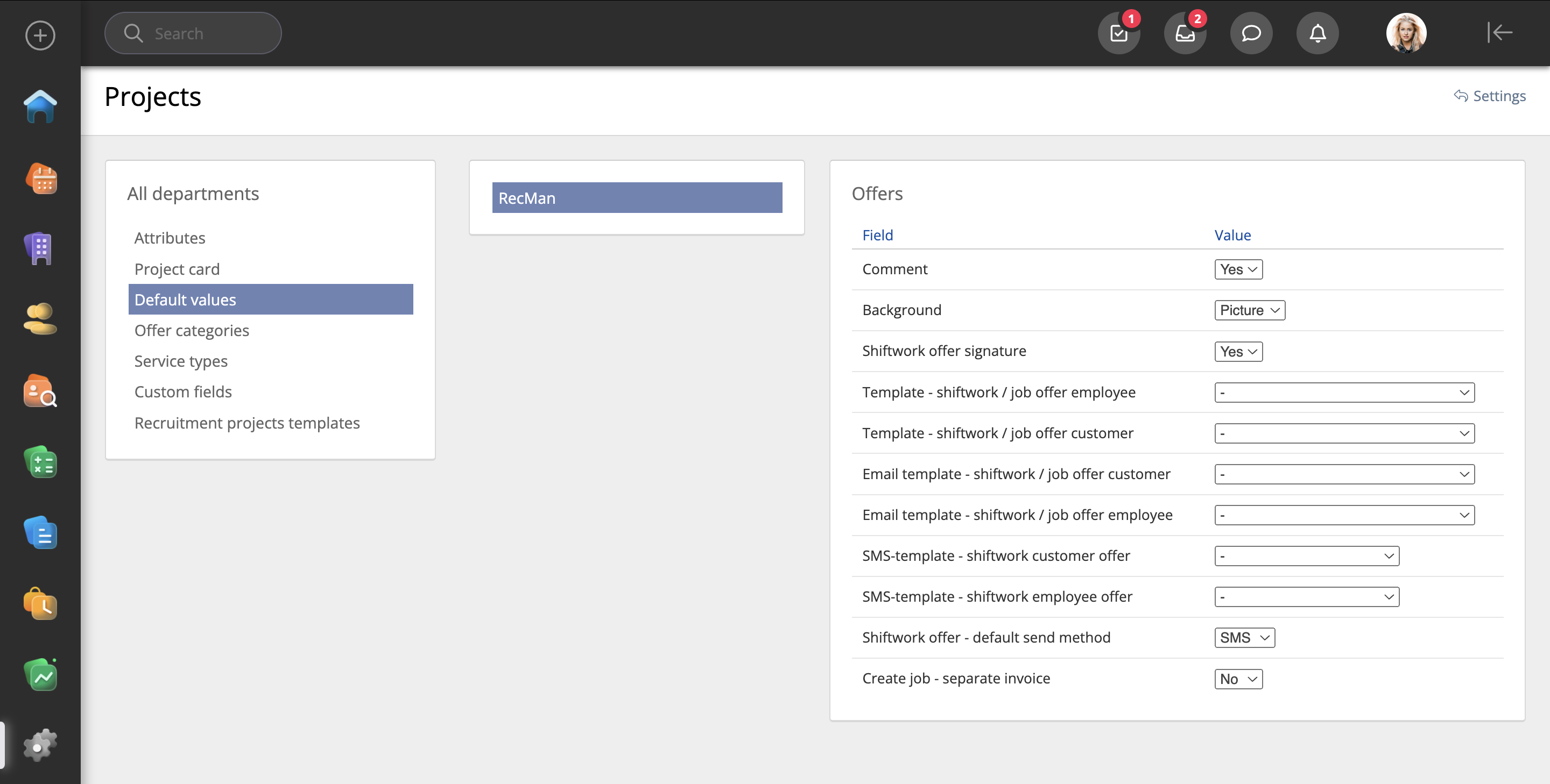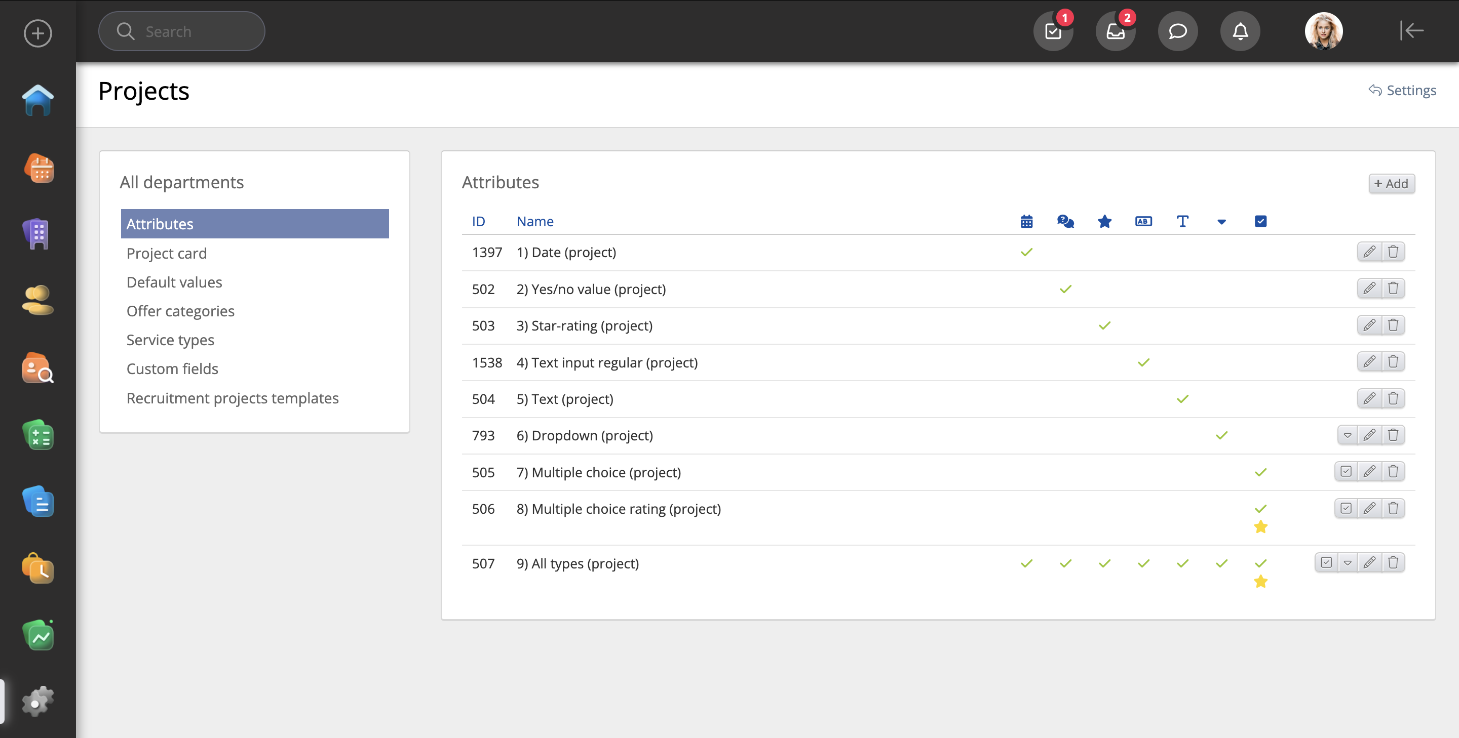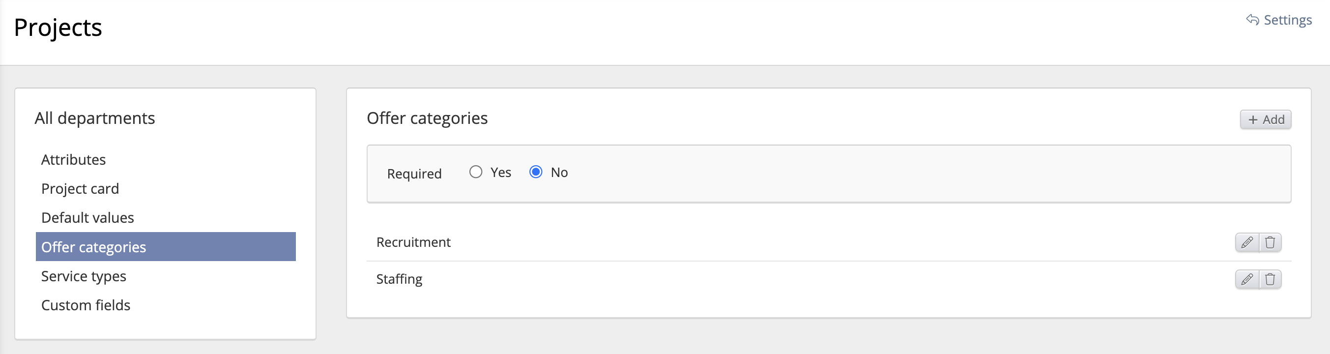 In the project settings, you can edit project attributes and the available fields in the project card, set default values when creating offers, and offer categories and service types. Here, you also select which department these settings will apply to.