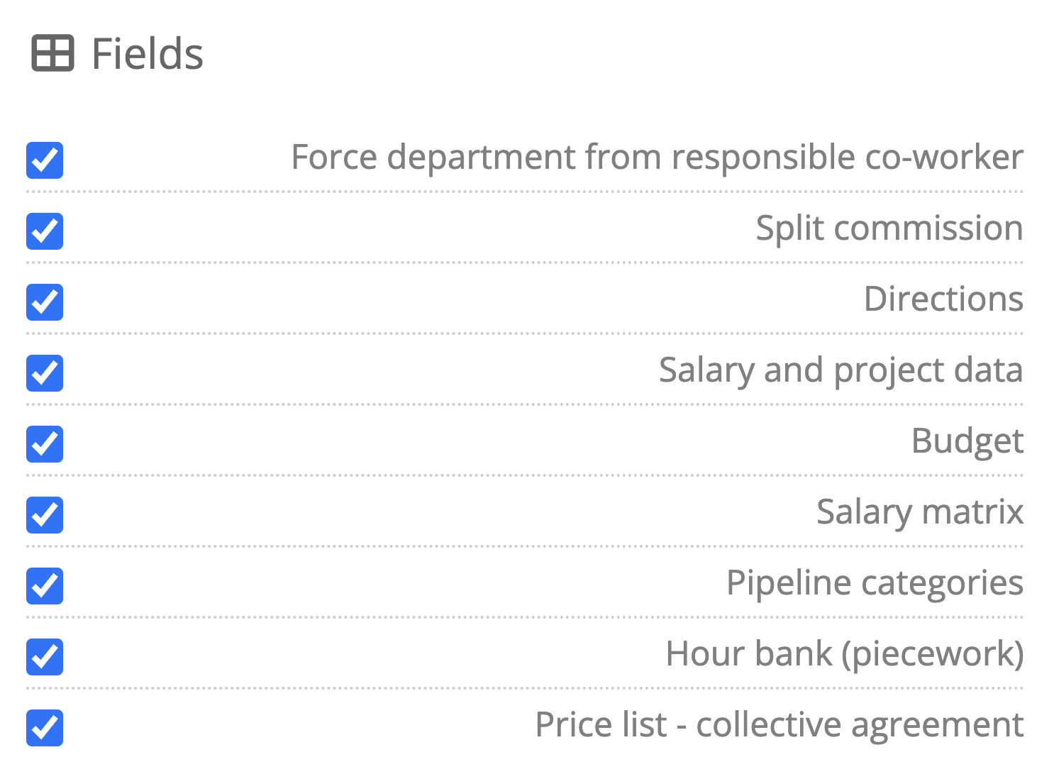 • Salary and project data – Enables the field Salary- and project data. This field enables you to define custom salary and project data for a specific project.