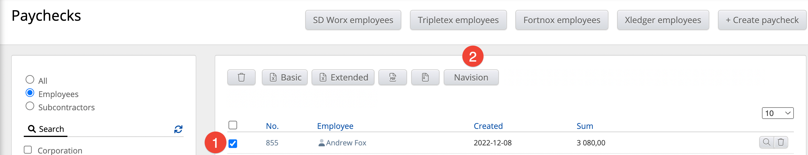 Go to Paychecks and tick on one or more paychecks. You see that Navision comes as a choice for export.