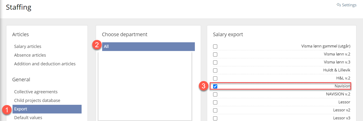 Go to System Settings → Staffing → Export → Select department(s) → check off Navision.