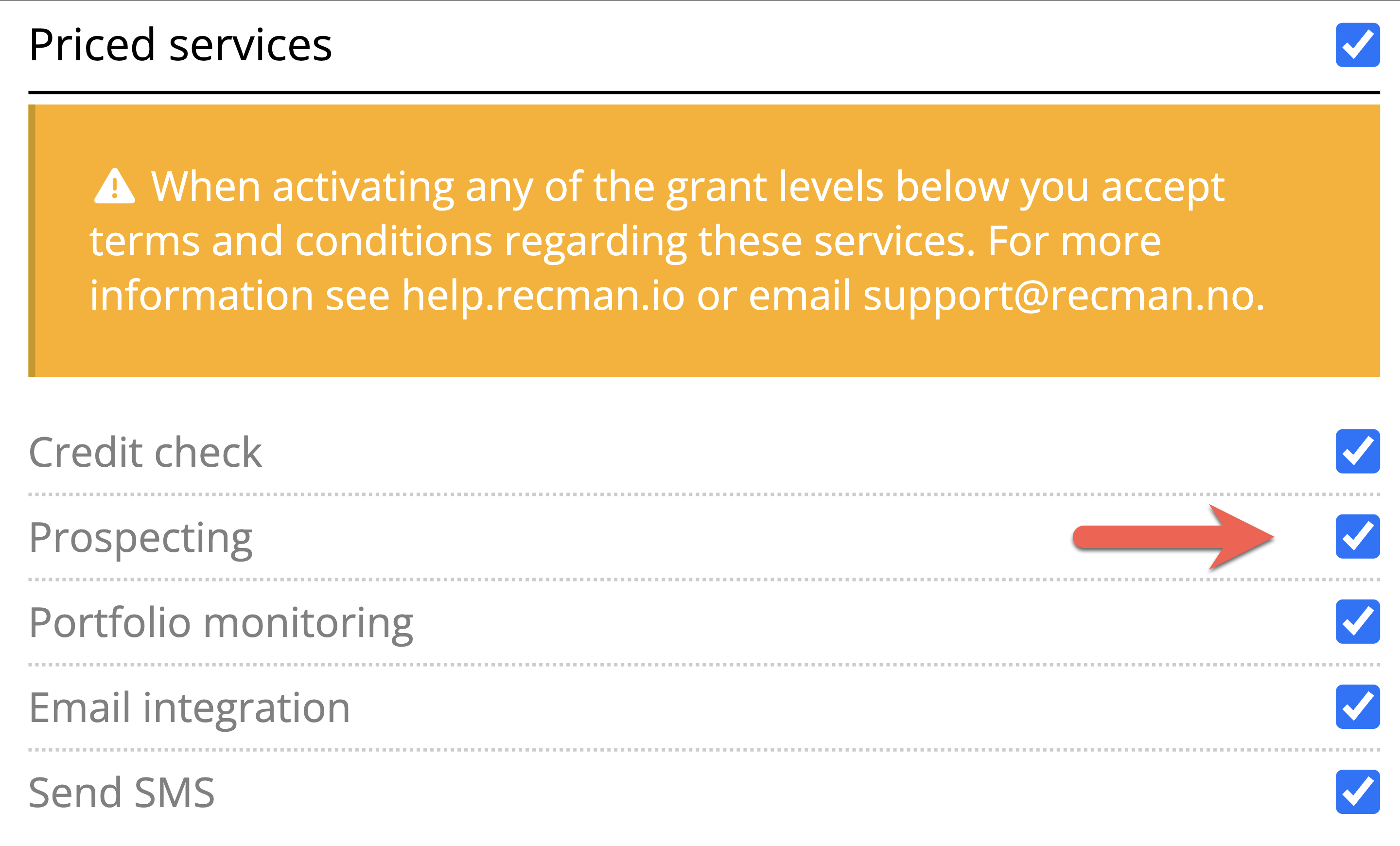 To activate prospecting, you have to be a system administrator and activate it under Priced services in the user settings. You can access it by going to User settings (System settings → Co-workers), where it can be activated per co-worker.