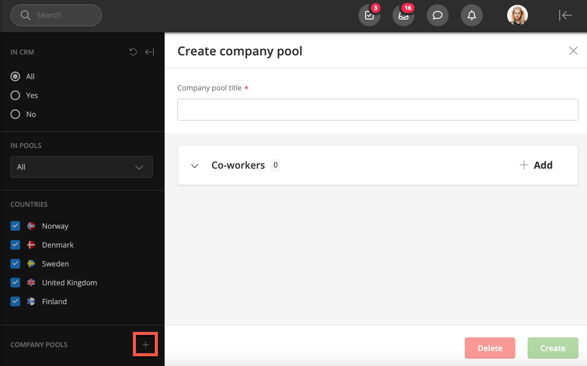 You can also add your own selection of companies to a Company pool. This feature can be used to save your searches or to create a leads list for potential customers.