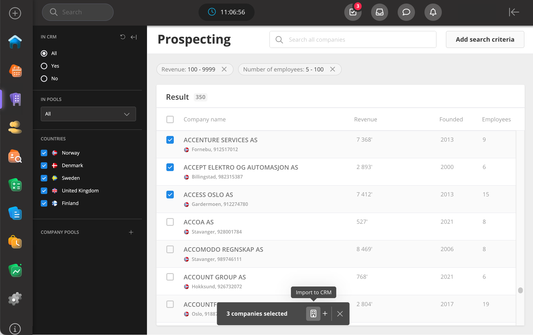 In the prospecting module, you first get an overview of the companies in the list, where you can filter for whether they already exist in the CRM, are added to the pool and which country it should show for. The available countries are Norway, Denmark, Sweden, the United Kingdom, and Finland. By selecting a company, you can then click to import it to your CRM: