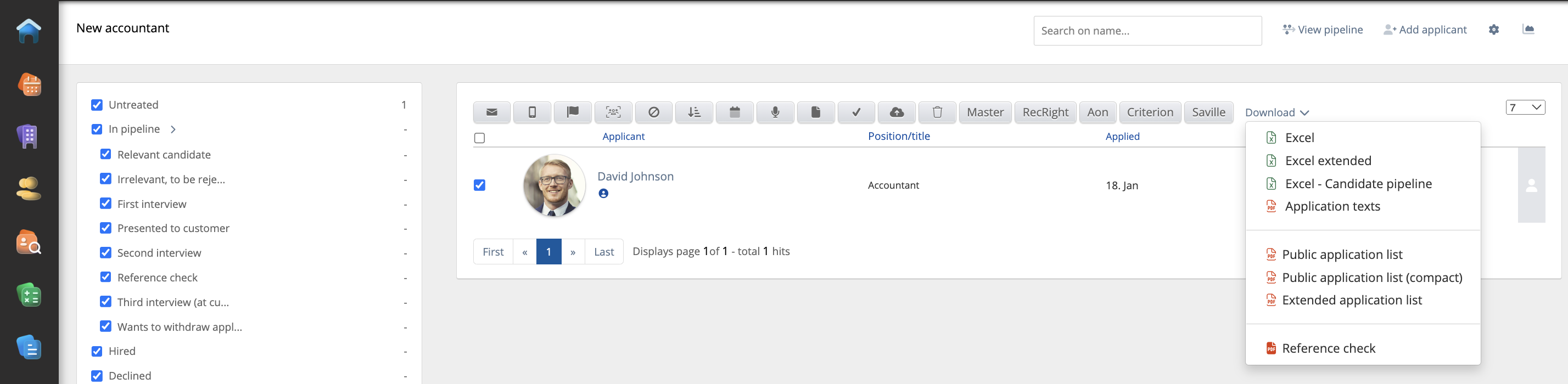 In RecMan, you get access to the extended applicant list by going in via the candidate list - selecting the candidates - and selecting the extended applicant list from the top menu button Download.
