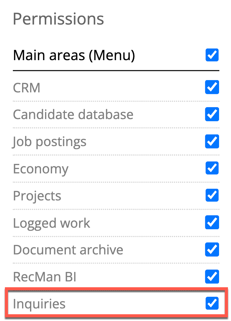 Like everything else in RecMan, the Inquiry Module can be hidden from some co-workers if desired. In the System settings → Co-workers → Permissions, you can grant access to the Inquiry module under the Main areas section and also to their settings under the General section.