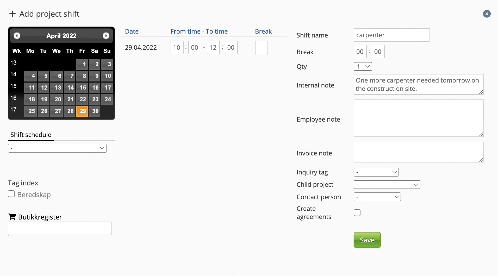 After you press Save, you will see a box identical to the one used to create project shifts. Here, you can change the information about the project shift before pressing Save, which will create the shift.