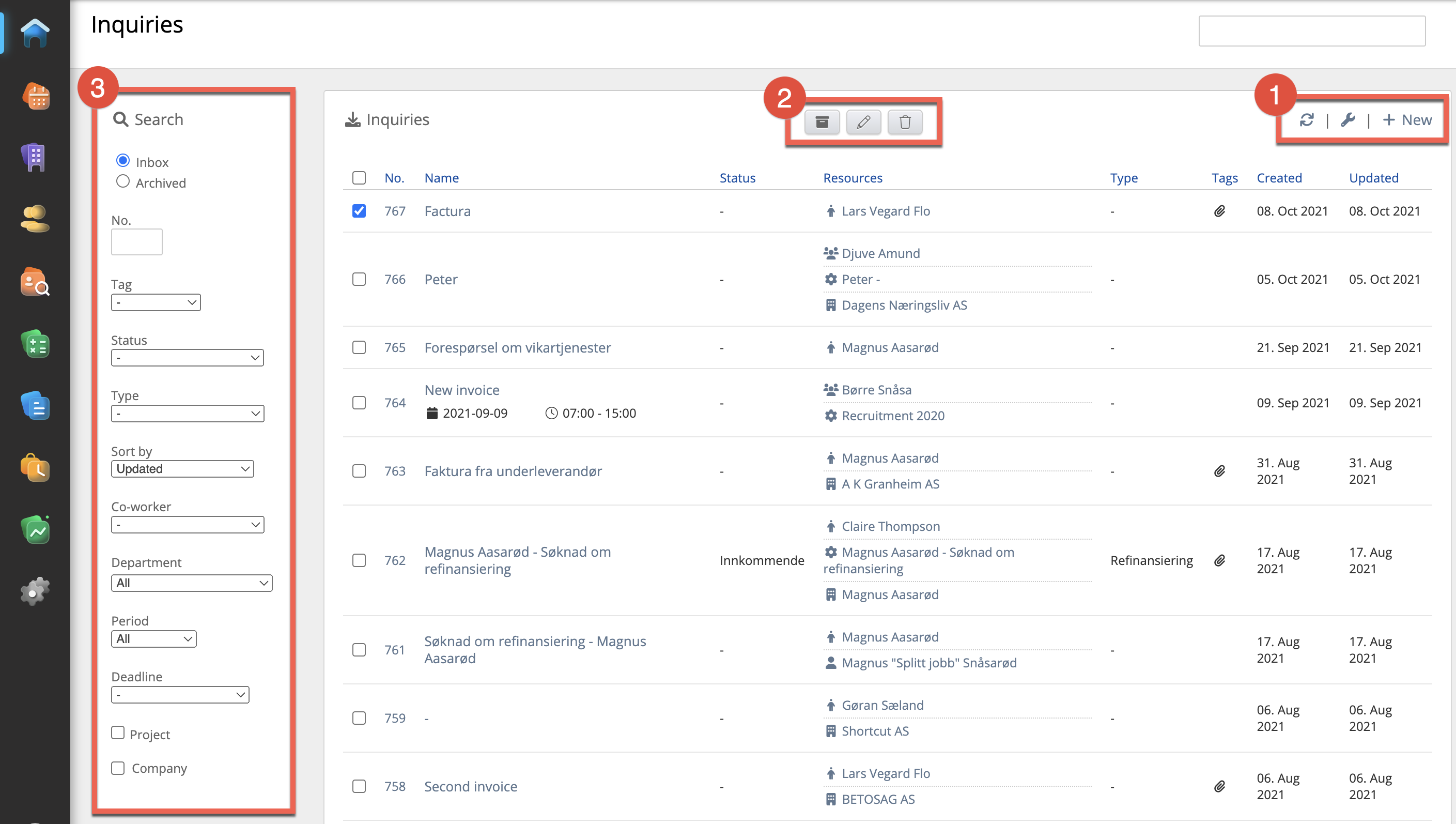The Inquiry module is where you receive orders from customers and general inquiries. An inquiry can automatically be inserted into the system by phone, email or API. Once received, they can be made into a project shift, for instance.