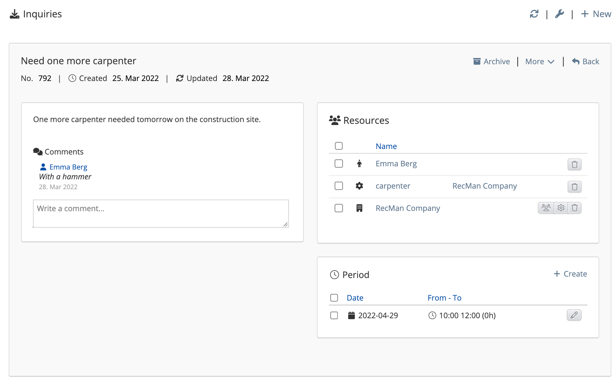 Once added, this information will appear in the overview. Click the inquiry to see a detailed view and to add or change any information.