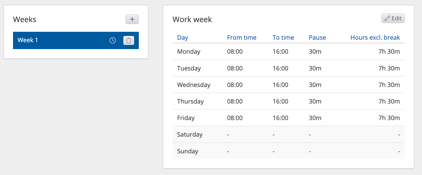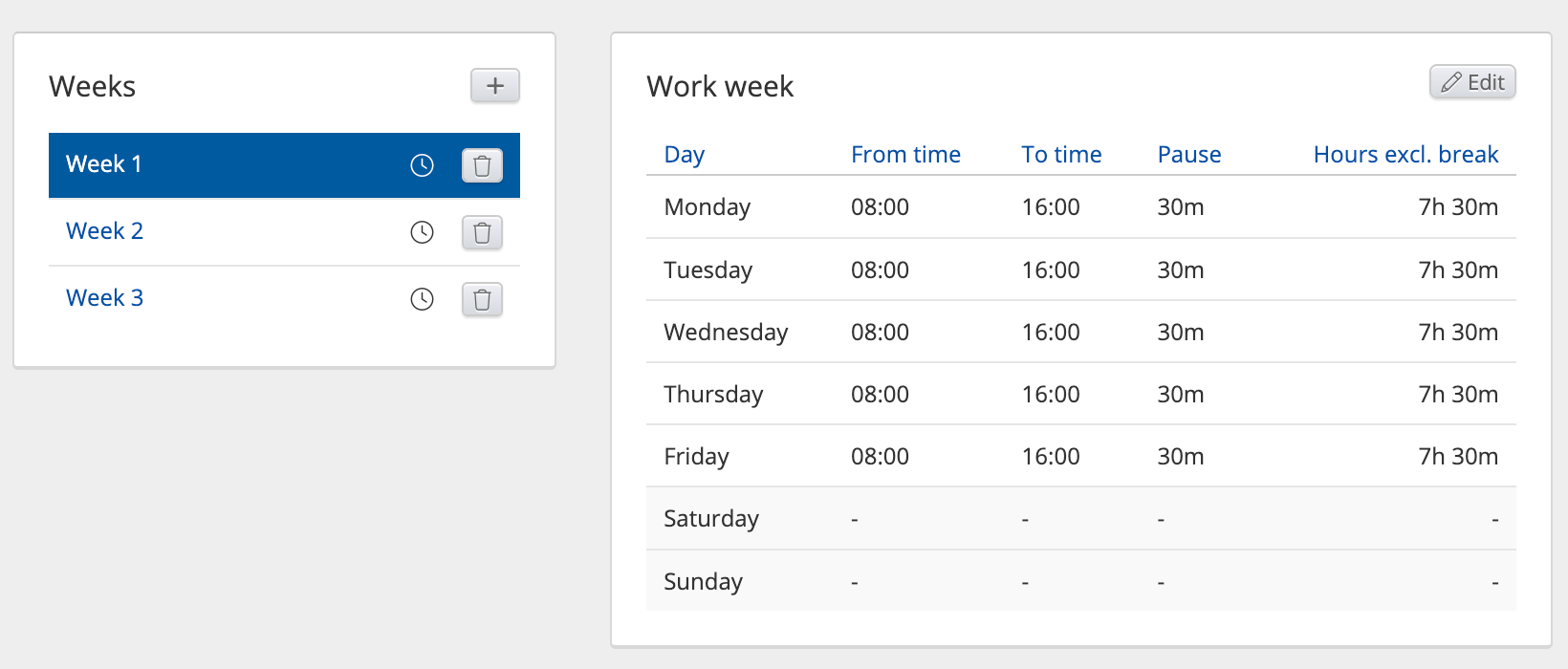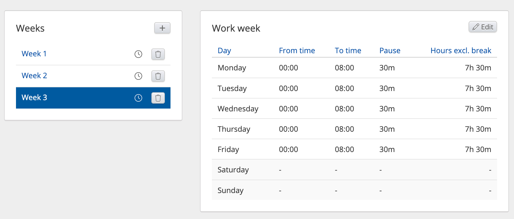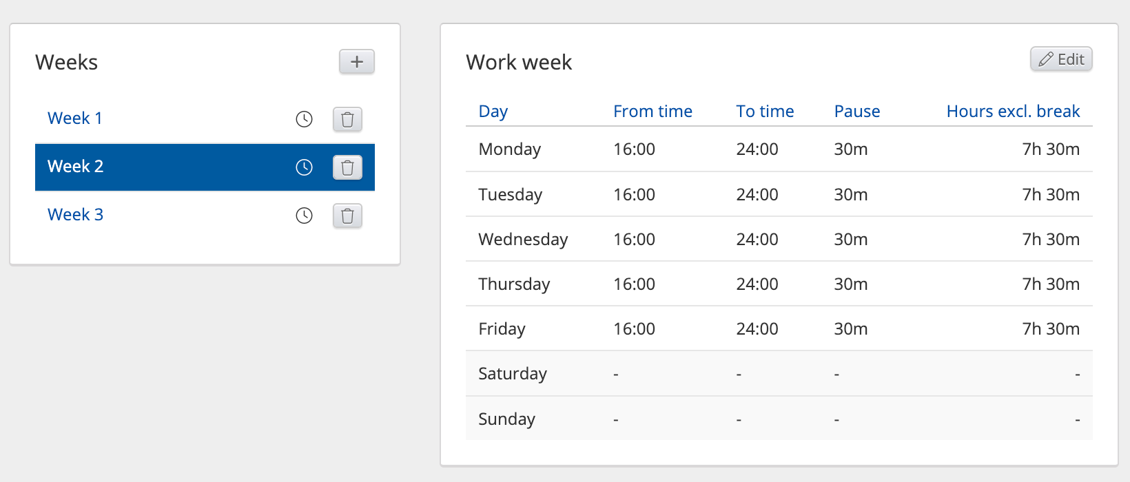 Example 1: To create a shift schedule for an 08:00-16:00 job*, repeating weekly, one week will suffice and defining, e.g., Monday to Friday 08:00-16:00.