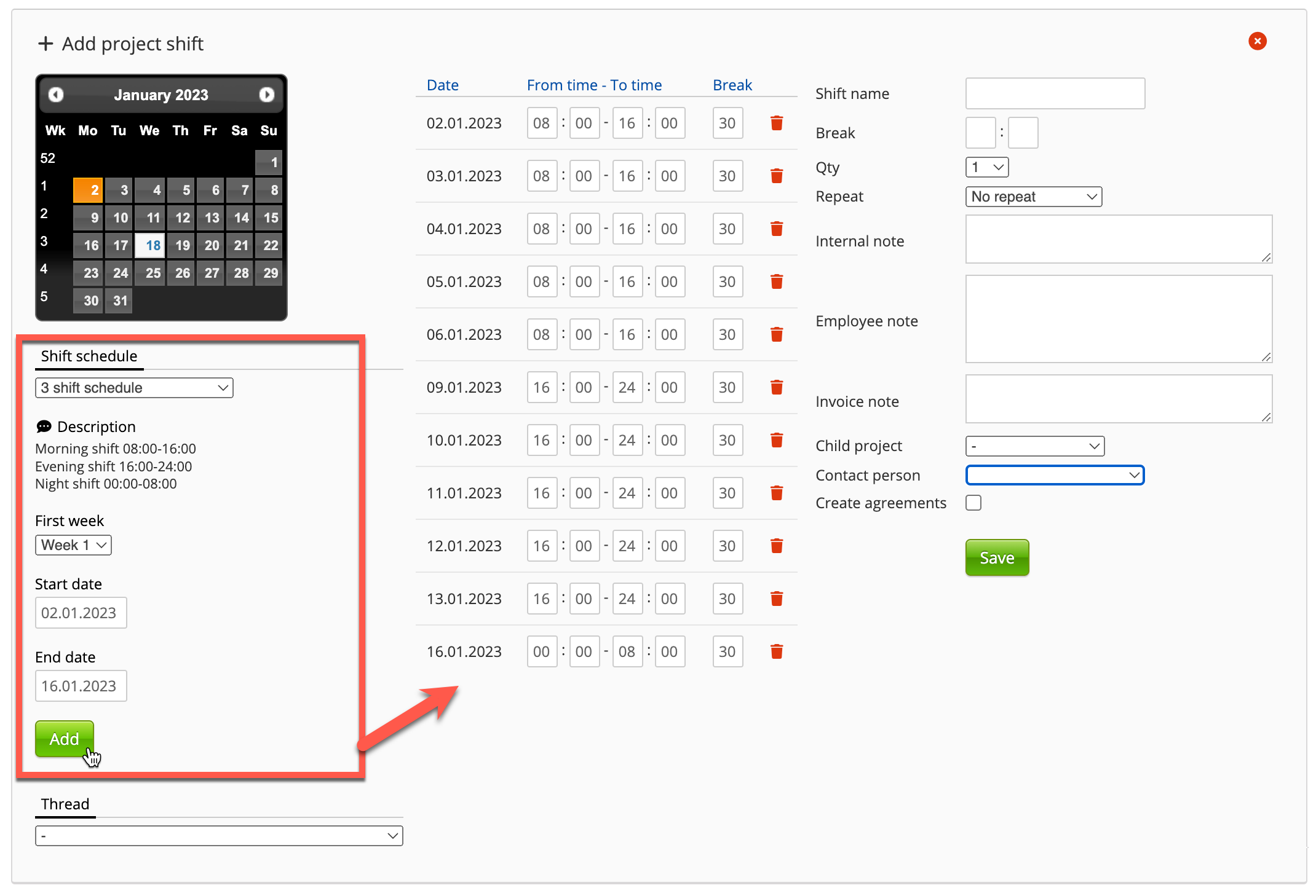 - Start date and End date: Defining how long the shift schedule should be repeated.