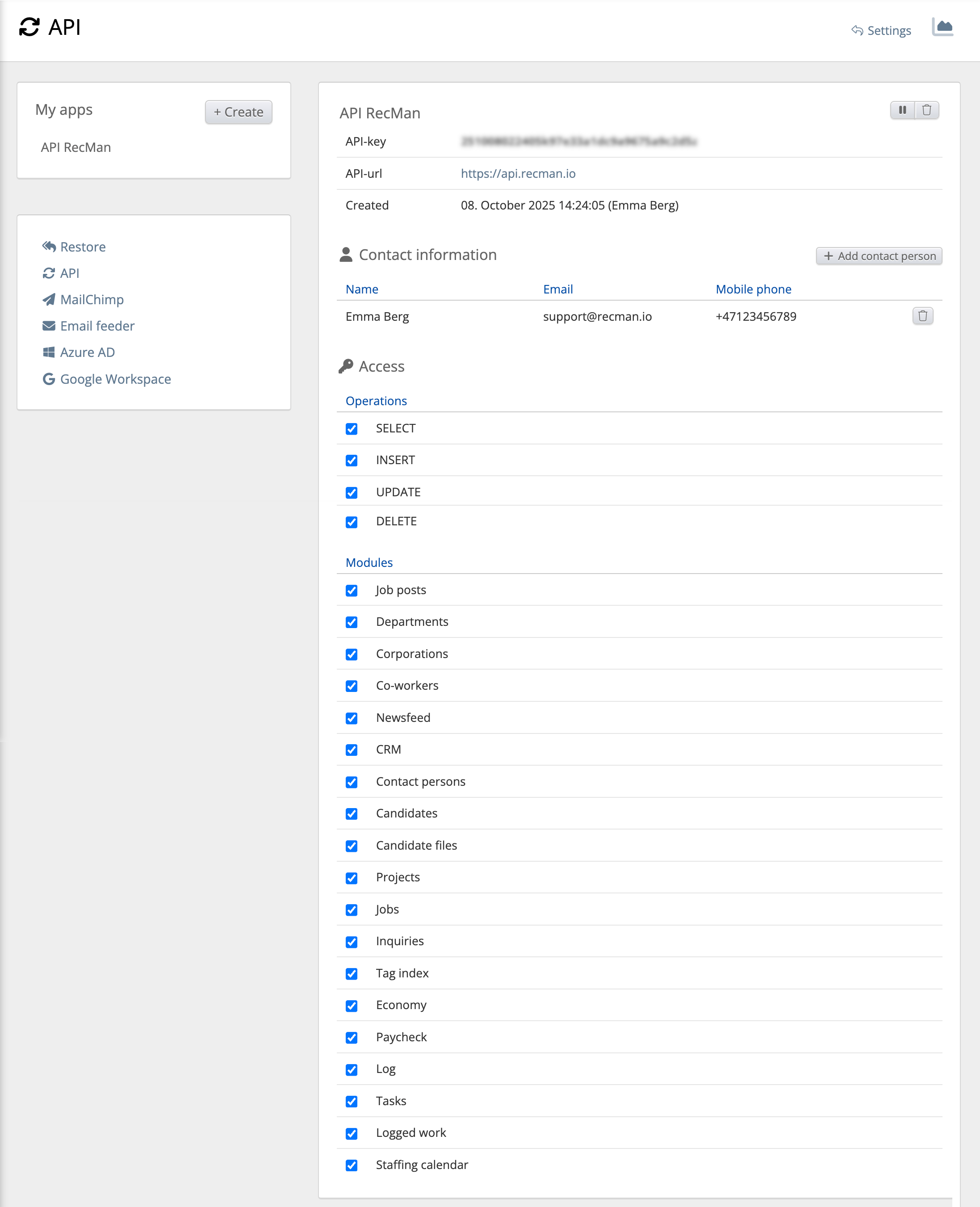 RecMan has an open API, and should you want to add an API key, provide access, or connect modules, this is where you can do it. To read more about our API, click here.