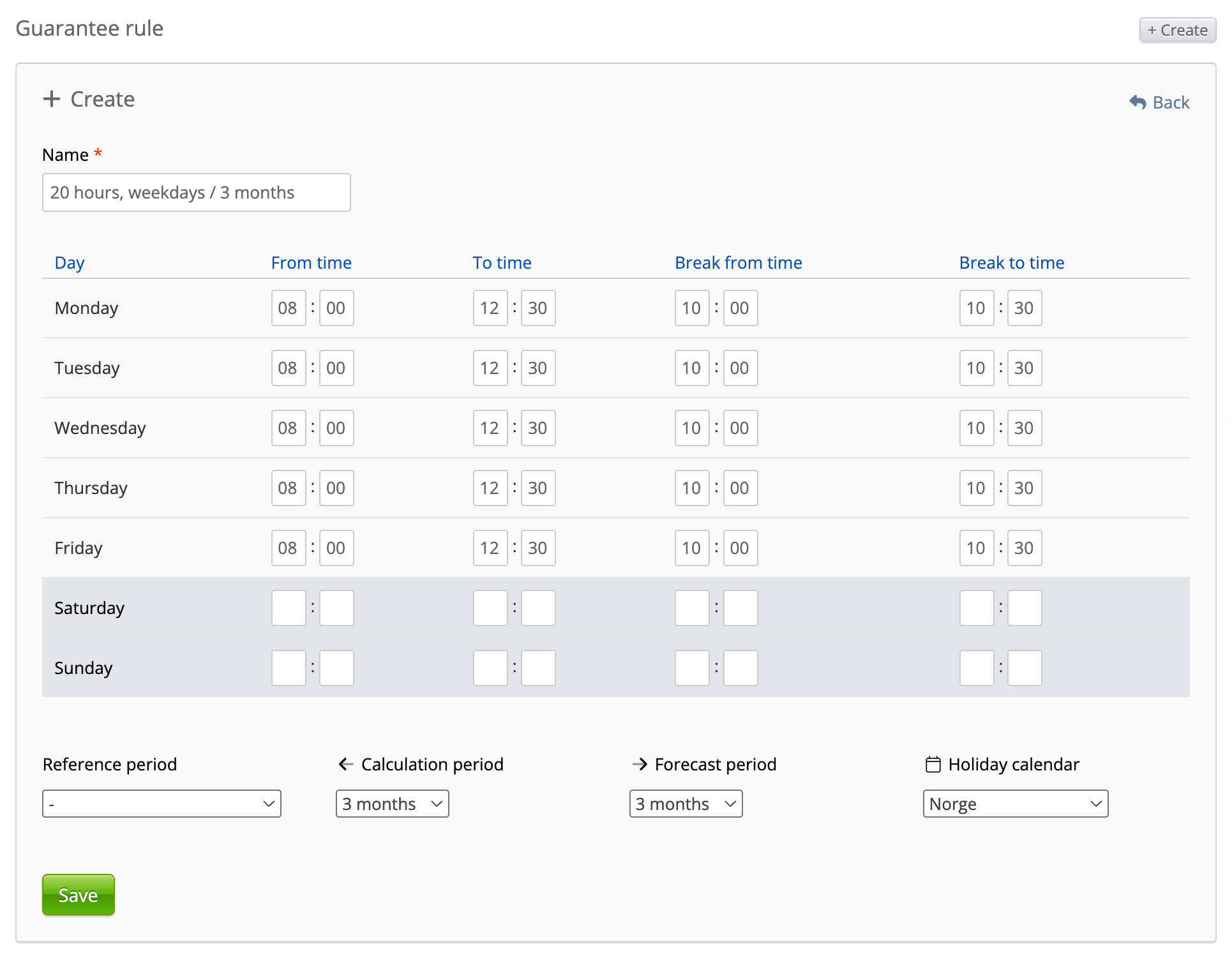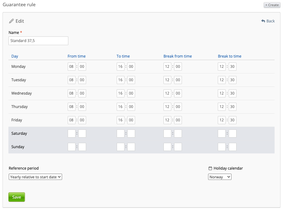 The reference period is a way to specify what timeframe the guarantee rule should consider. The “Calendar year” period will use 1st of January to 31st of December as the focused period, whereas “Yearly relative to start date” will use the employment’s start date and 12 months into the future. If no reference period is specified, you may configure it with a calculation period and an optional forecast period.