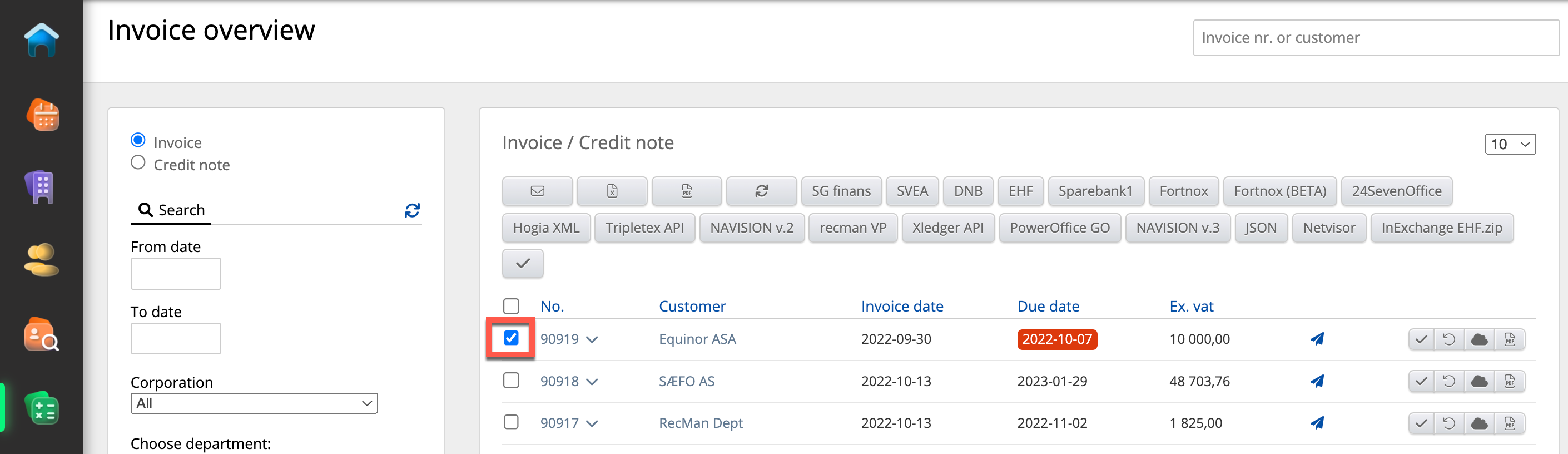 After following the steps above and defining your factoring partners in the system settings, these will appear as options for invoice export in the invoice overview. This can be seen in Economy → Invoices → check off the invoices you want to export → Export.