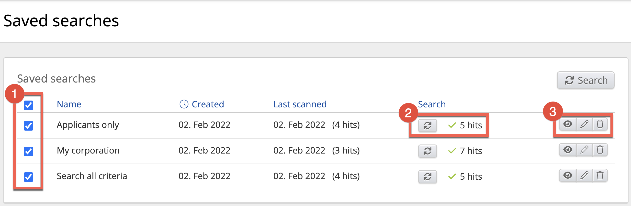 In the picture above, you can see the layout of the Saved searches page. Follow the numbered steps to understand what the different areas in this view mean: