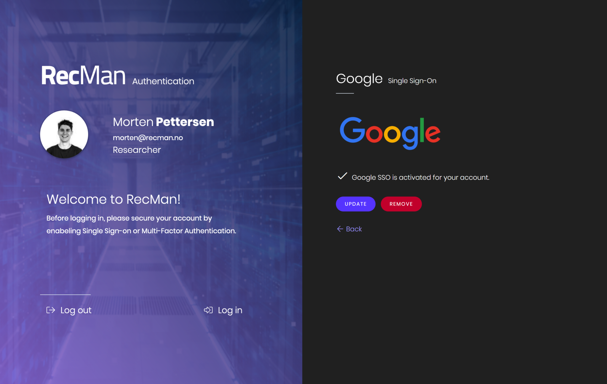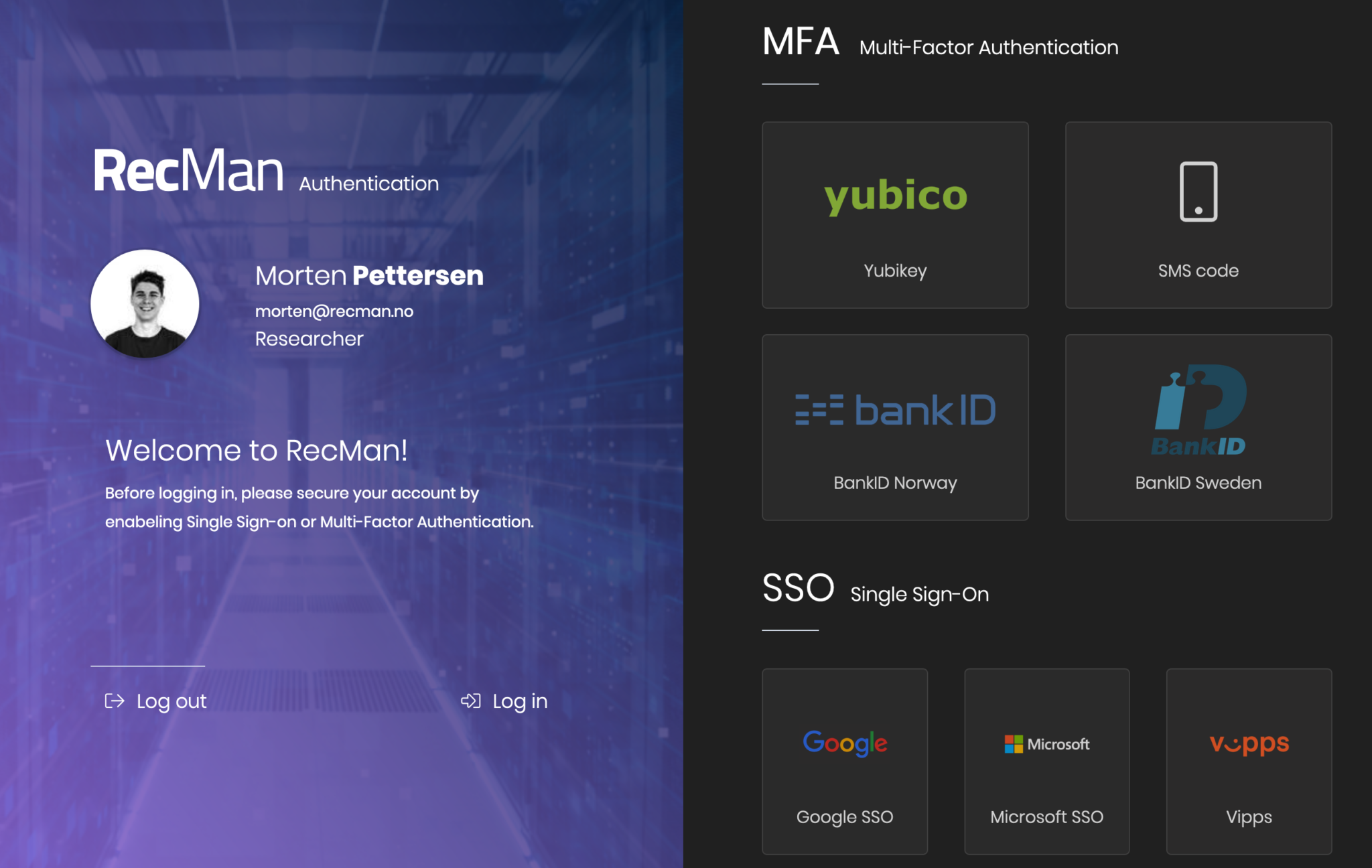 In RecMan, there are different methods for Multi-Factor Authentication (MFA) and Single Sign-On (SSO). If you wish to set up such authentications for your user access, you are free to do so from My profile. Note that you will only be able to apply the methods that have been enabled in your RecMan.