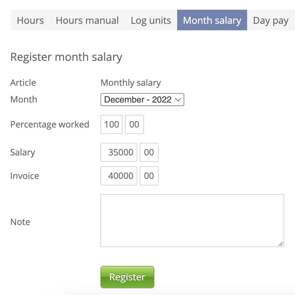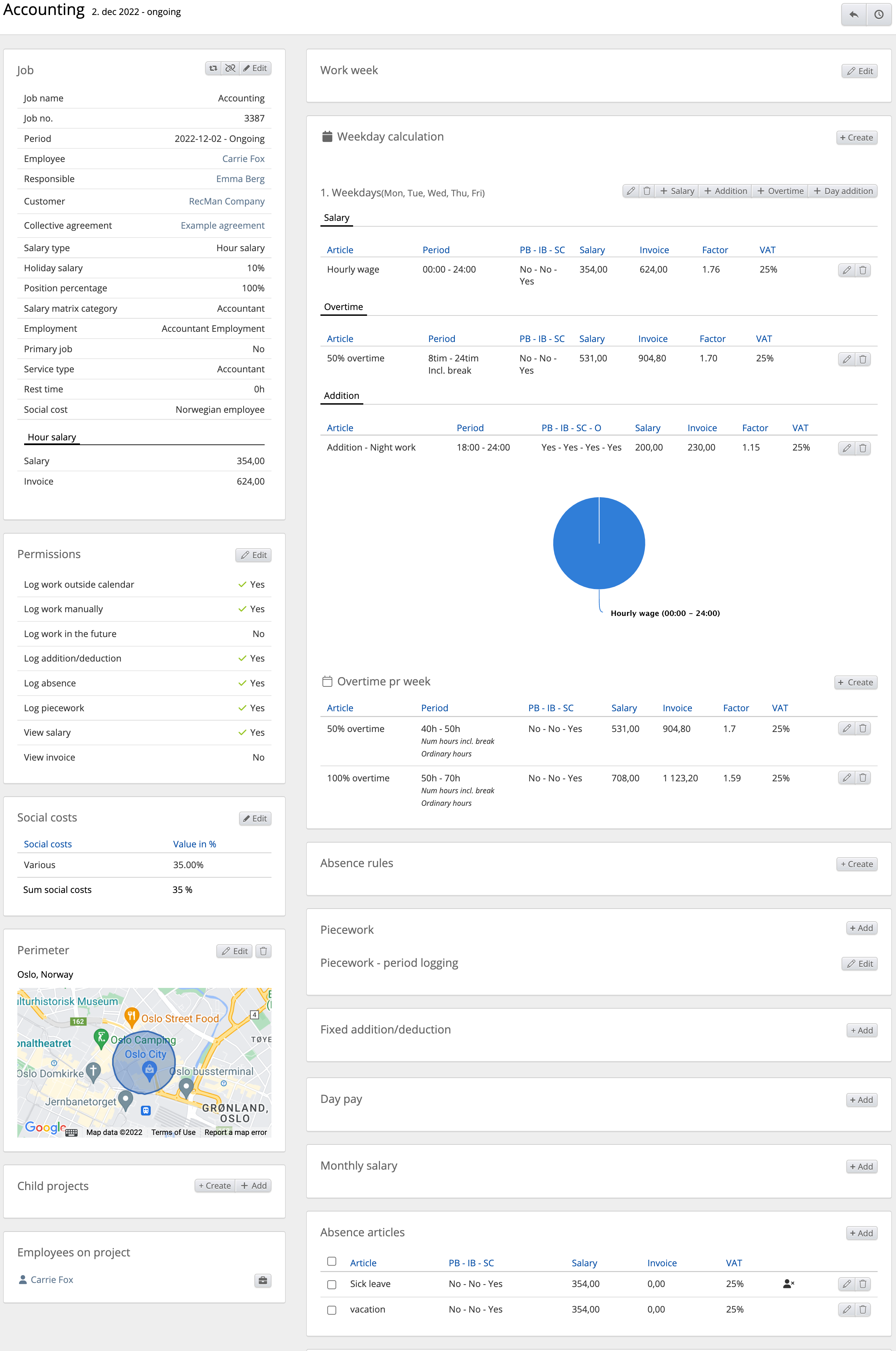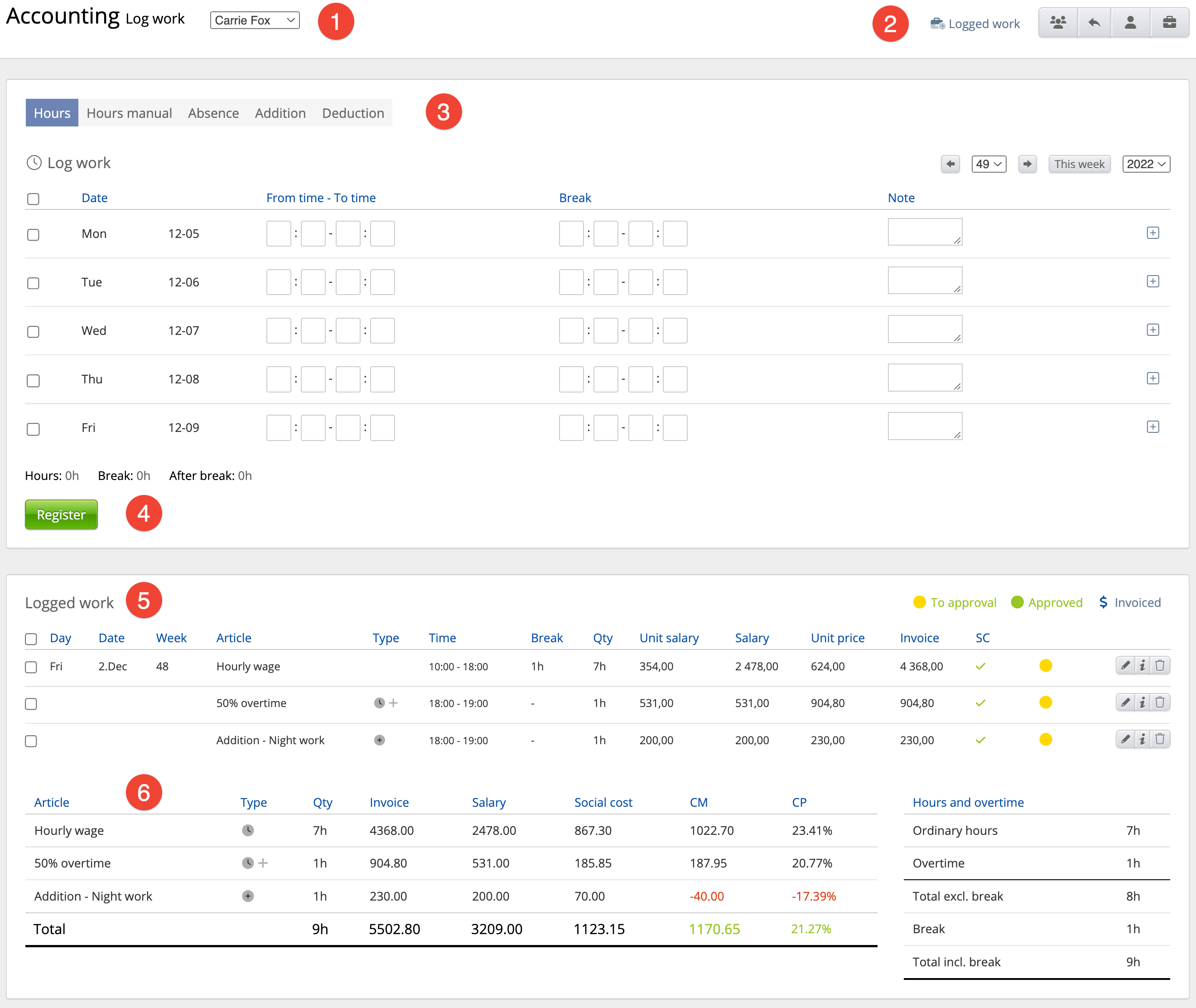 6. Summary: Here you get a summary of the recorded work, separated into regular hours, overtime, sick leave, etc., as well as salary and invoice price.