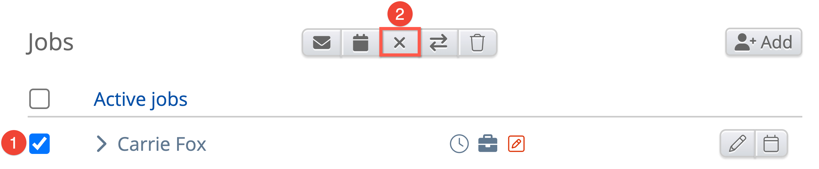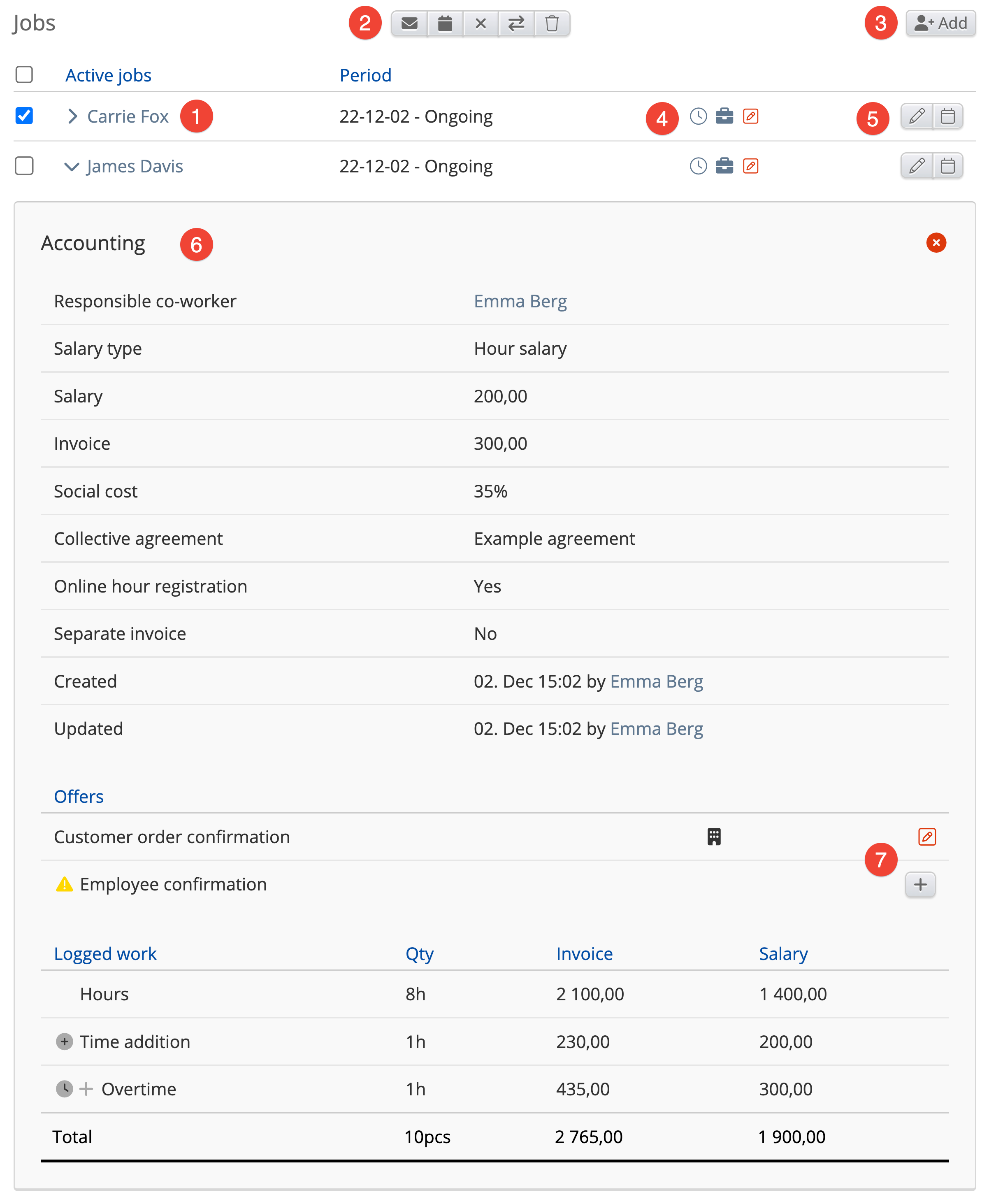 1. First, we can see the names of the employees, along with the ability to check one or more jobs. Checking an employee will make the buttons on number 2 appear.