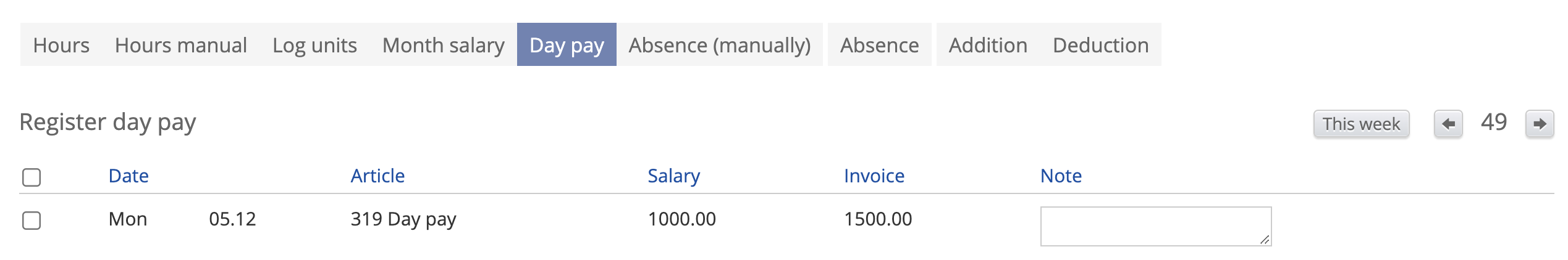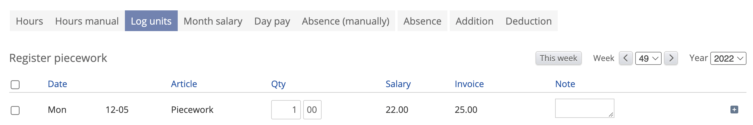 Additions Absence Daily salary Piecework Monthly salary Manual registration