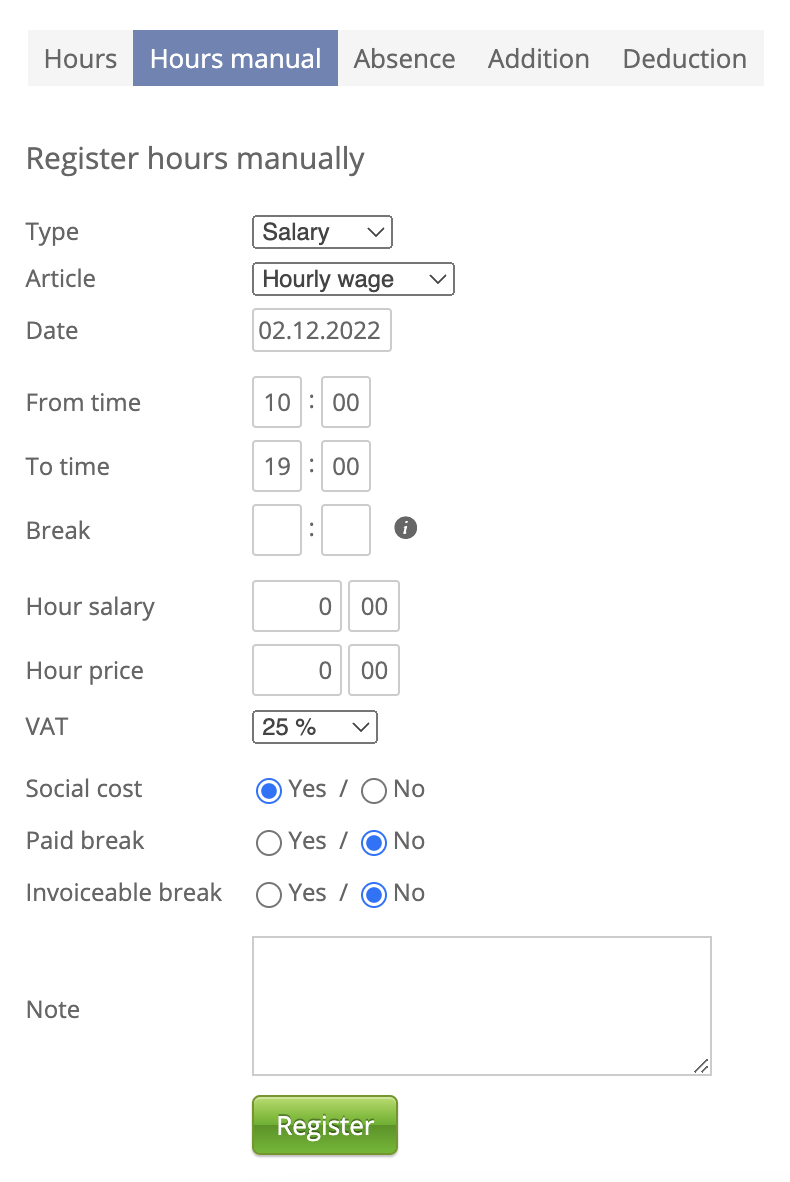 3. Registration window: This is where you can register hours. In general, you need to input the start time, end time and select which days before pressing the Register button to record the work. Note that some article types are registered differently, and examples are provided below.