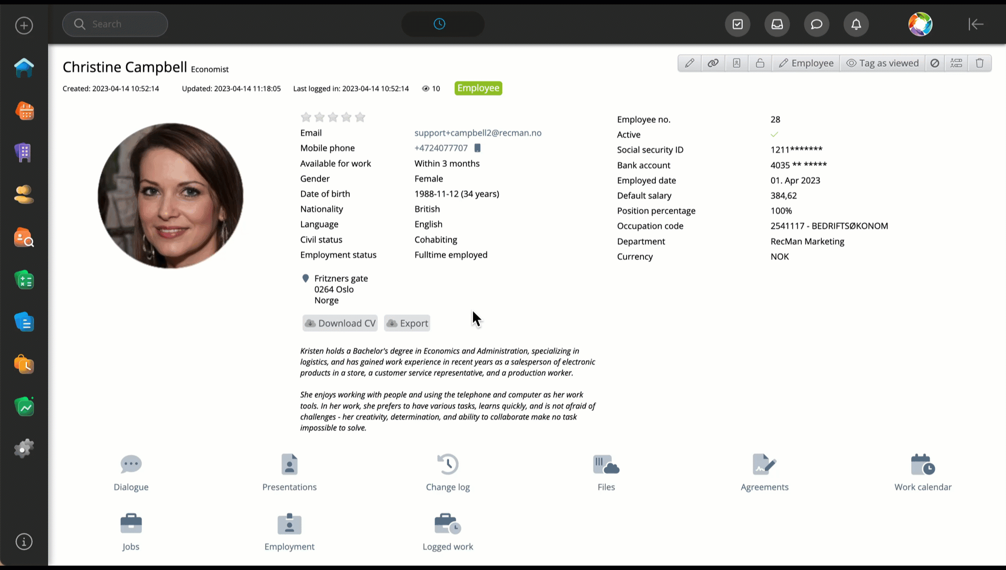 To create a job in RecMan, you must first employ a candidate by approving them for staffing. Doing this will classify them as an Employee. This can be done from the top right of the candidate card and will extend the candidate card with additional tabs such as Jobs, Employment, Logged work, and "work calendar." By going to the Employment tab and inputting additional information such as salary and position percentage, this will be applied as well when creating a job.
