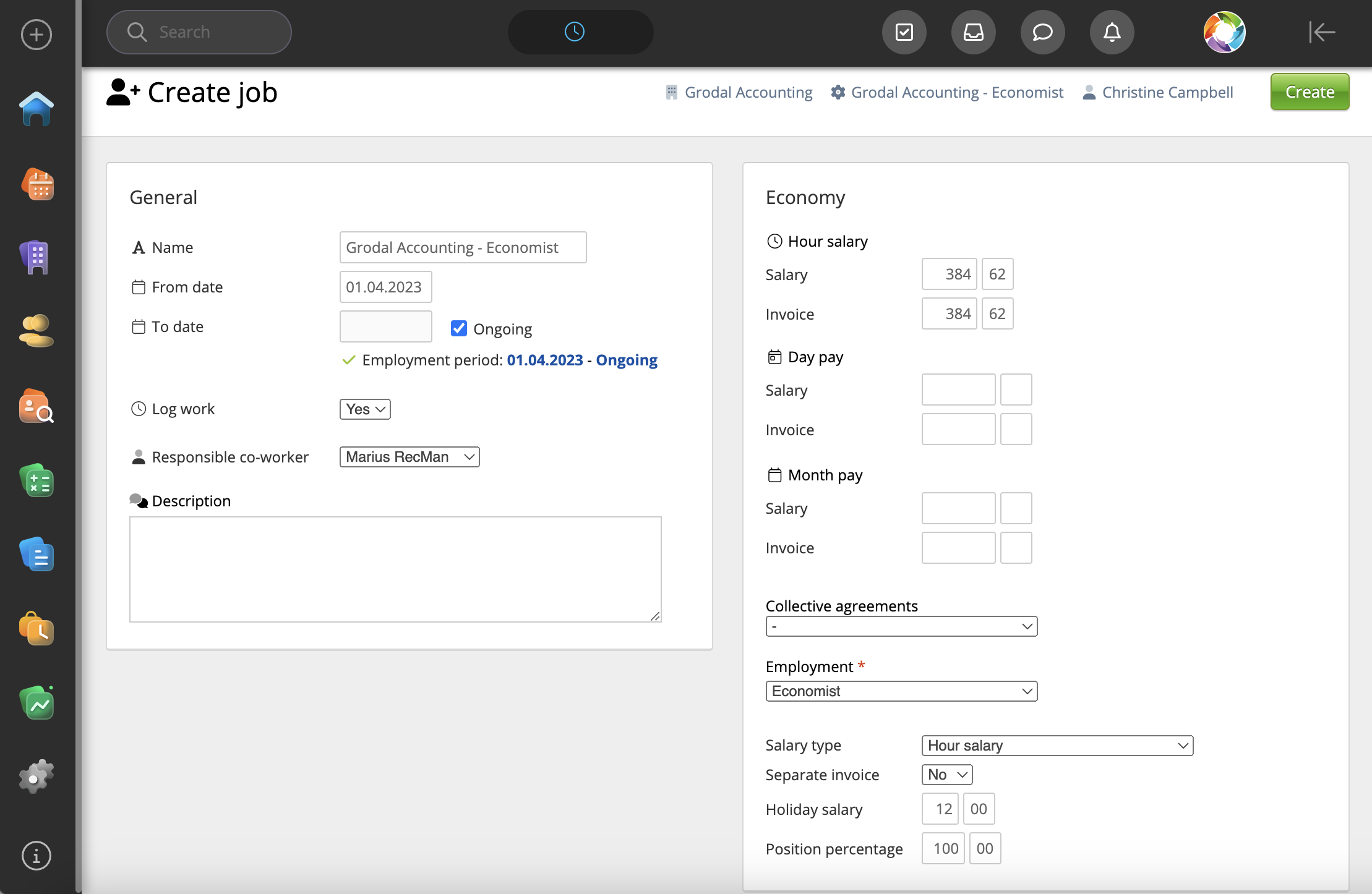 This will open the Create job page where you input the job period, salary and invoice, collective agreement and additional details.