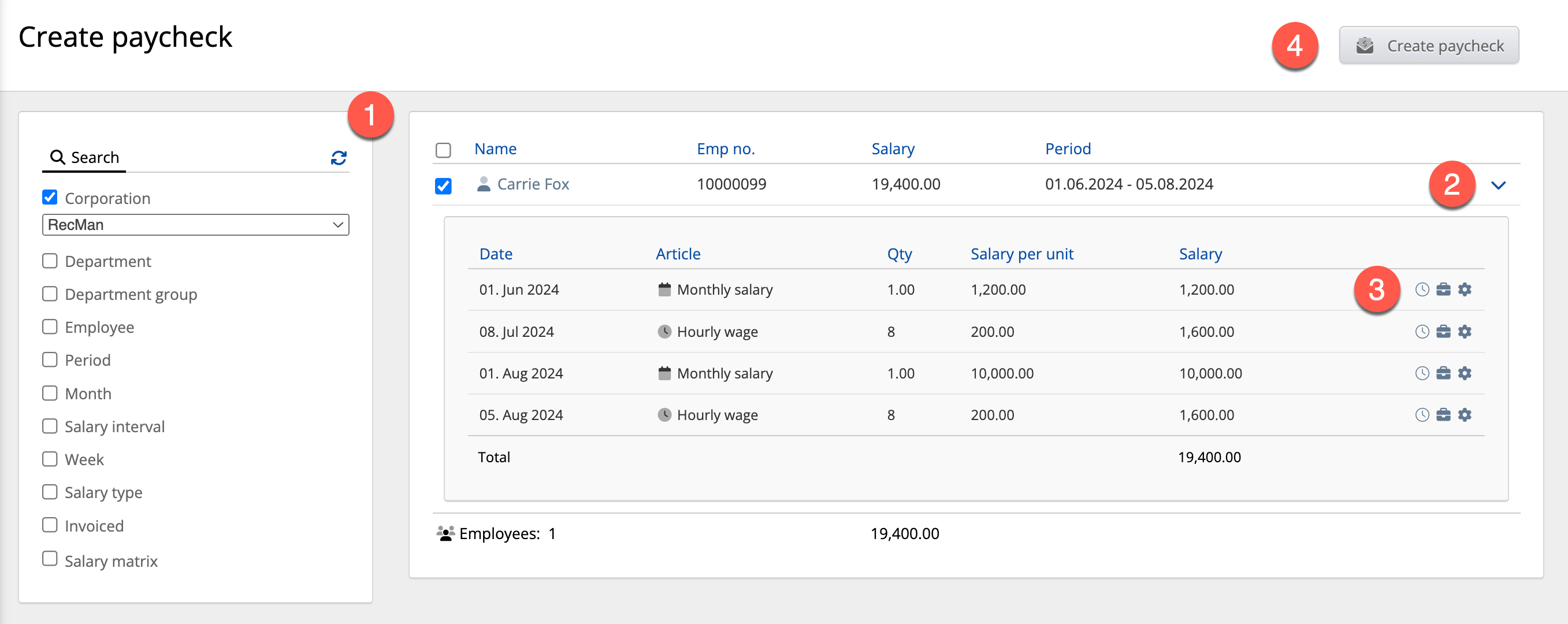 When entering the payroll page of the RecMan staffing solution, you will get an overview of all the employees that are on the payroll. Follow these numbered steps to fully understand what the different functions on this page can do.