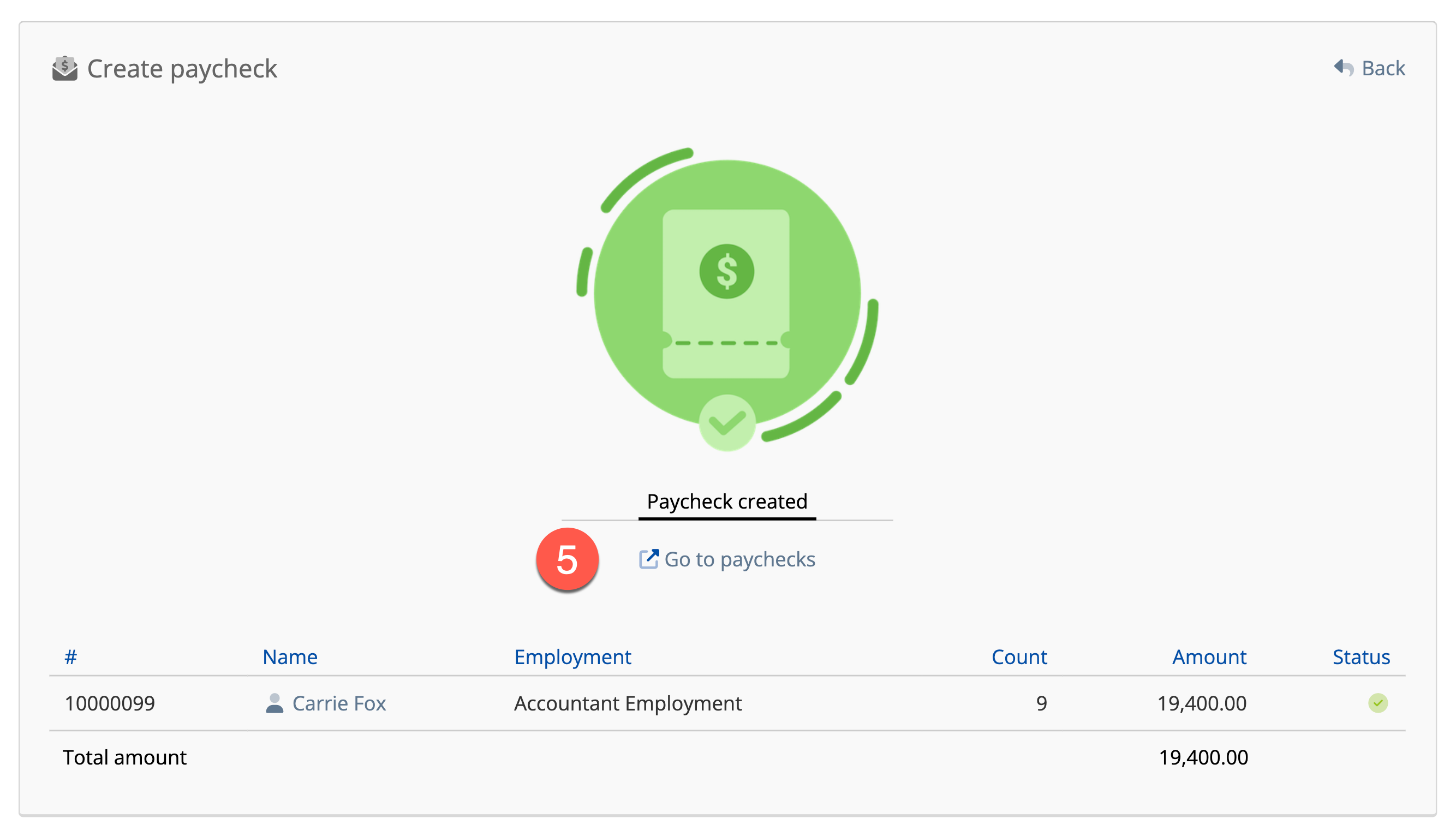 - After checking off the box to the left of the names, you are able to create a paycheck by clicking on this button. After pressing the Create paycheck button, you will get a receipt that paychecks are created.