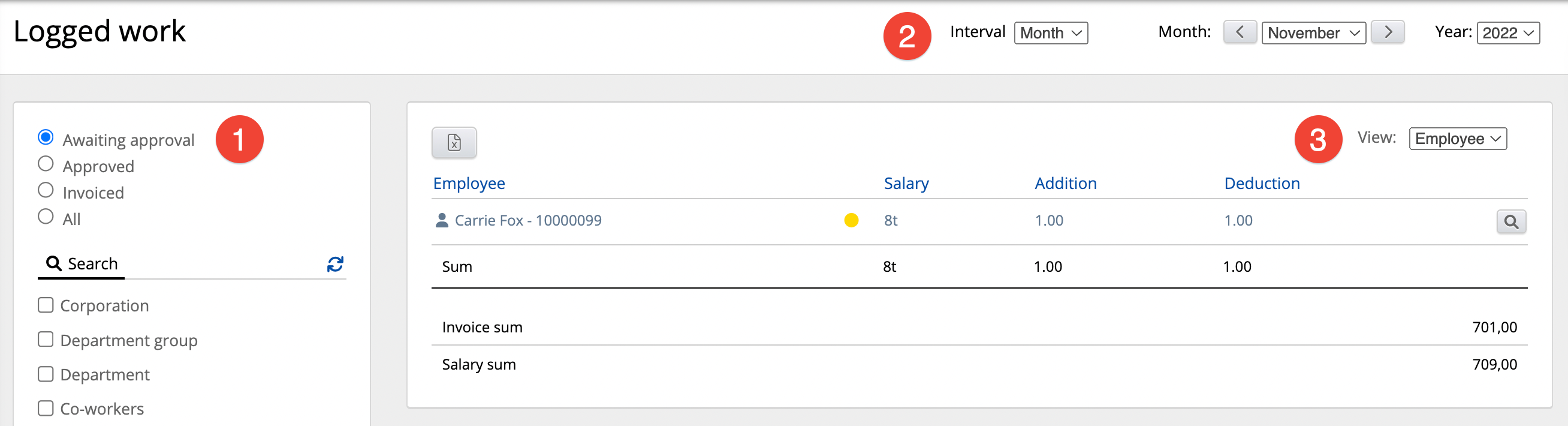 The employee overview in the Logged work module