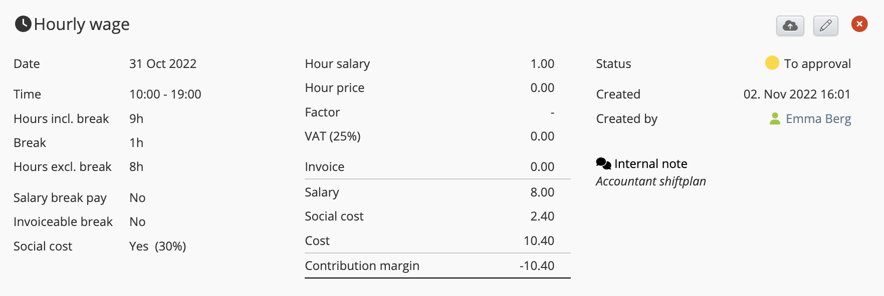 If you press an article when you are in the detailed view of an employee (the magnifying glass in the picture above), you will get information about this particular article. The example picture below shows information about the article Hourly wage from 2 November 2022. Here, you will be shown information about what is logged on this article, the calculation of salary, contribution margin, and information about the time of creation and the creator.